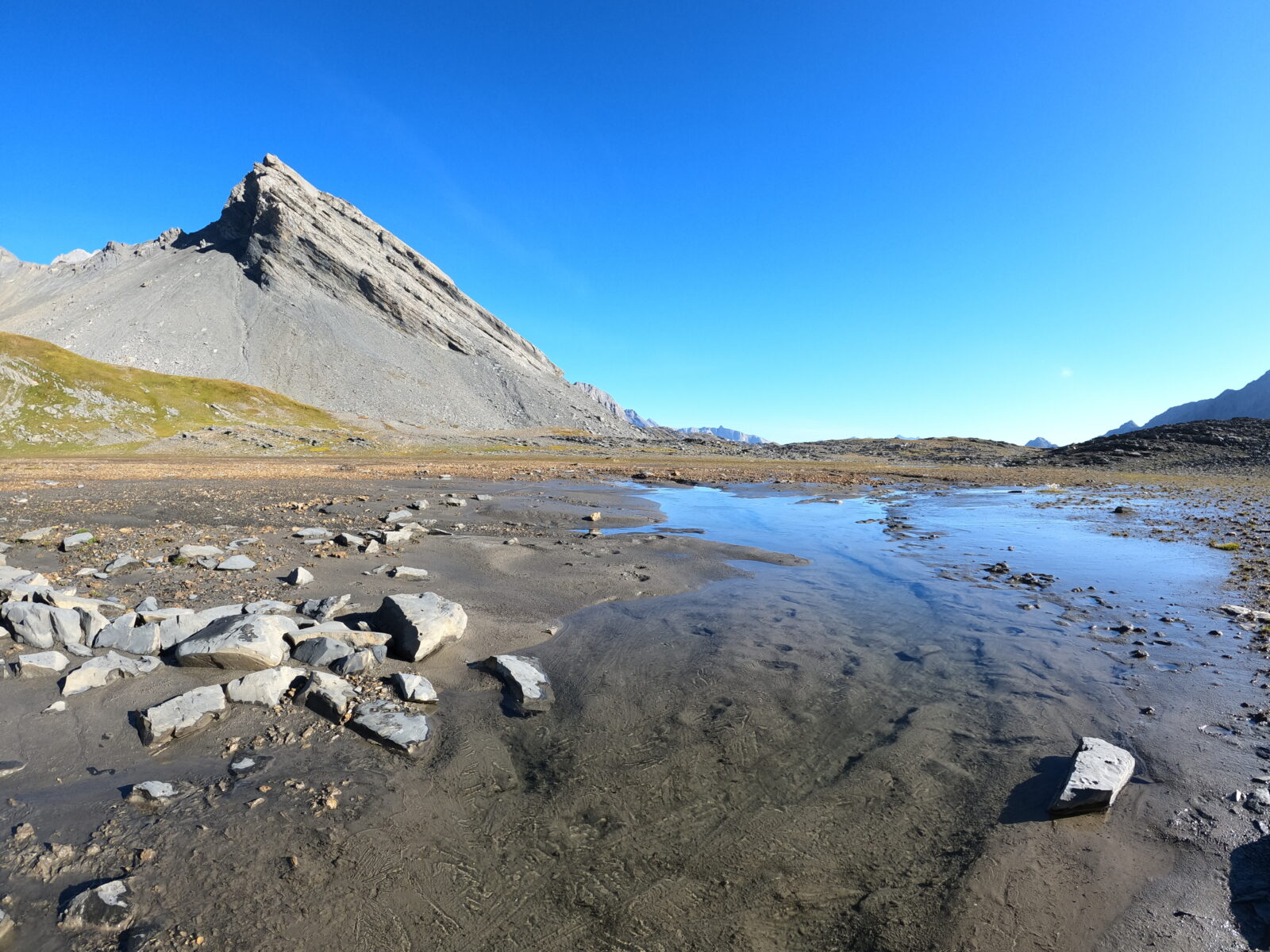 Le torrent est à sec, cet automne, mais il reste encore de la neige de l'hiver dernier. Ce beau paysage quasiment vierge devient malheureusement une exception. Les belles montagnes des Alpes sont de plus en plus exploitées, construites et polluées.