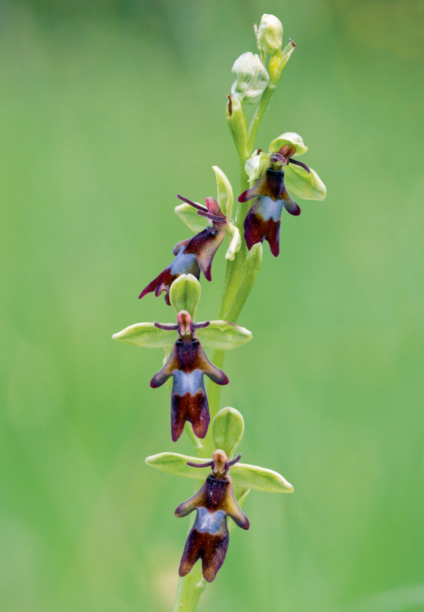 Plus loin, un autre village se dessine. « Cette partie de la vallée de la Loire est assez urbanisée et touristique, précise Guillaume Delaunay, les châteaux et la célèbre abbaye de Fontevraud devant nous font parfois de l’ombre à la nature qui les entoure. » Par chance, la sépulture d’Aliénor d’Aquitaine est entourée d’une grande forêt. « En sous-bois, on trouve d’autres espèces d’orchidées plus difficiles à repérer. » On finit par dénicher quelques pieds d’une plante portant plusieurs fleurs sombres pourvues de bras, de jambes et d’une paire d’antennes. « Elle aussi possède un nom d’animal : l’ophrys mouche. Sa fleur imite un diptère pour attirer les insectes qui viennent en croyant voir un congénère. Dupés, ils s’accouplent à la fleur et la pollinisent malgré eux. »