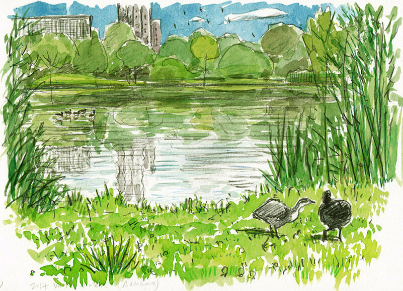 « J'aime visiter ce parc urbain, situé juste à côté de Paris. Le grand étang est richement bordé de roseaux. On peut y observer des oiseaux d'eau, des passereaux, des insectes... Ce jour-là, l'intense chaleur invitait les martinets noirs à venir s'abreuver. Les inévitables bernaches du Canada introduites prenaient leur bain au milieu de l'étang, tandis que sur la rive, une jeune foulque quémandait de la nourriture à l’un de ses parents. »