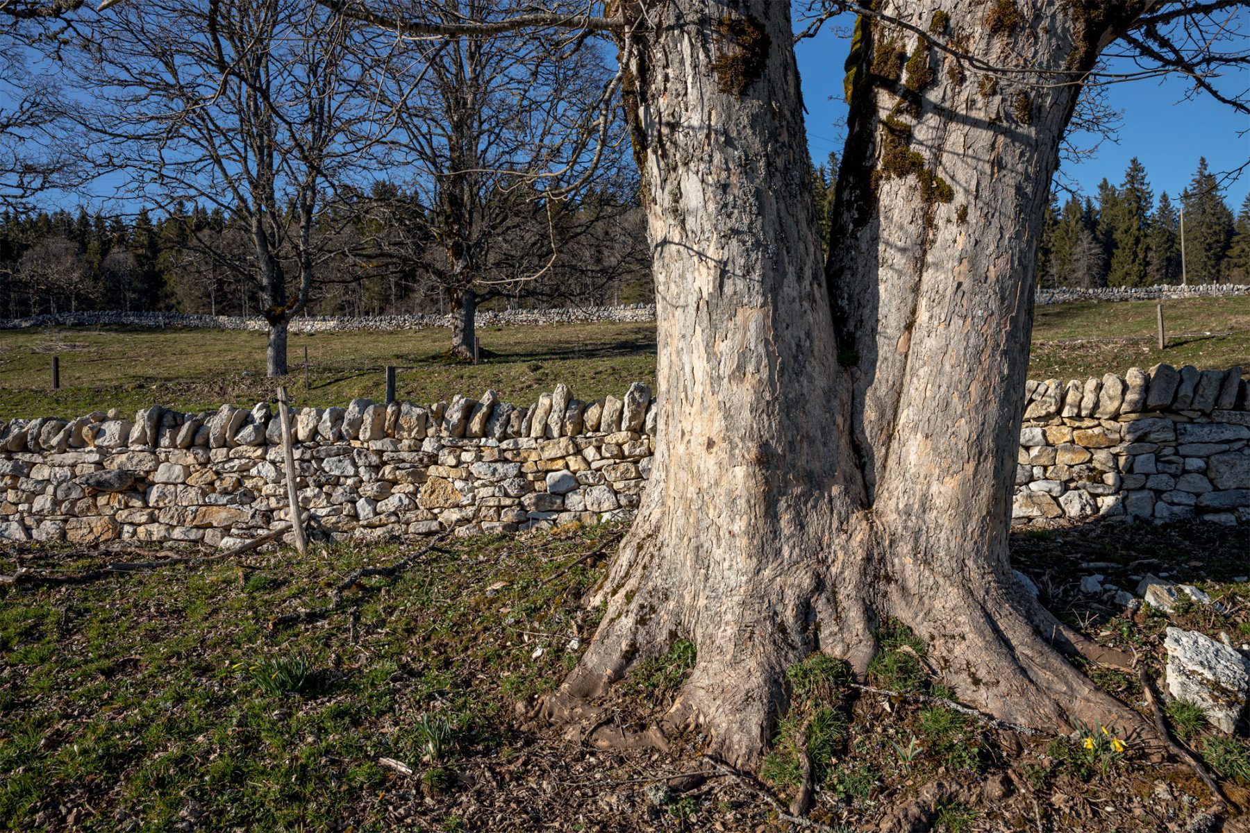 Le paysage s’ouvre, la forêt fait place au pâturage boisé. De nombreux vestiges de murs en pierres sèches courent le long des lisières ou à travers les clairières. « Ces constructions datent de la fin du Moyen Age », m’explique Elodie. A l’époque, la forêt était surexploitée. Pour économiser cette précieuse ressource, les autorités ont interdit l’usage du bois pour dresser des clôtures et imposé celui de la pierre, disponible sur place en abondance.