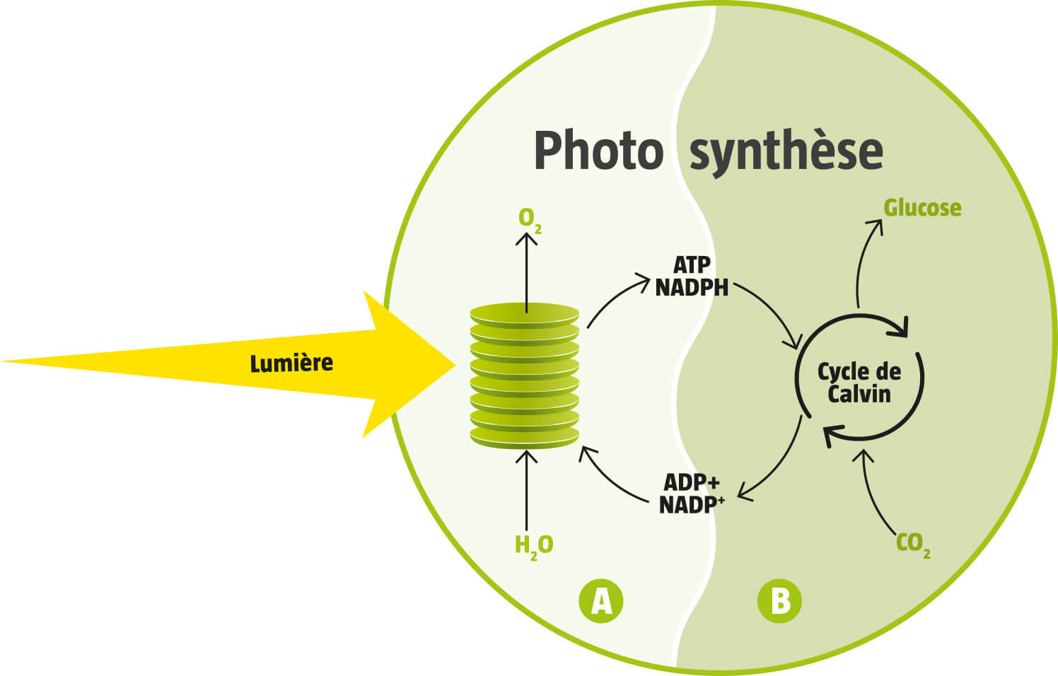Le miracle se produit en deux étapes. D’abord photo-, la lumière en grec, puis -synthèse, le travail chimique proprement dit. Dans les membranes, la chlorophylle transmet l'énergie lumineuse à de petites molécules qui la stockent momentanément. Puis, hors des membranes, un cocktail d’enzymes associe ces molécules à du CO2 pour produire finalement du glucose. L’ensemble du processus est extrêmement complexe, mais redoutablement efficace. Vous m’en voulez d’avoir à peine simplifié?