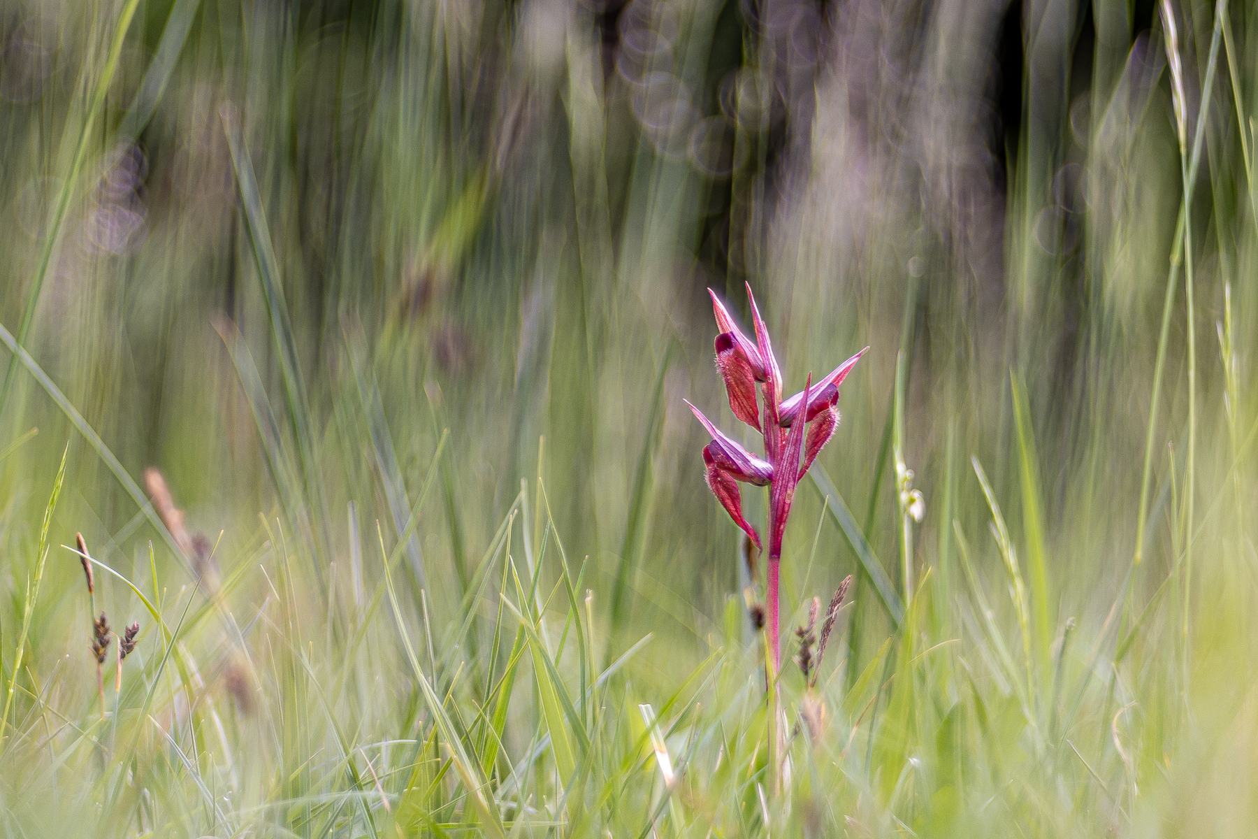 En quête d’inspiration pour une sortie printanière, je me balade parmi les souvenirs naturalistes de mon carnet de terrain. Je tourne la page et mon œil tombe sur des mots gribouillés avec enthousiasme entre une excursion au pays des lagopèdes et une matinée d’affût dans une héronnière. C’était un 18 mai, au Tessin, et elles étaient en fleur… Mes notes louent leur port élégant, presque hautain, leurs tépales aux traits décidés et ce teint écarlate unique. L’envie me prend de rendre visite aux sérapias à long labelle, des orchidées rarissimes en Suisse et désormais confinées à quelques prairies sèches du sud des Alpes! Chaque pas m’est familier le long du chemin qui serpente à travers de vieux châtaigniers jusqu’à leur demeure secrète. Les premiers pieds que je rencontre à la lisière de la forêt sont en train de se faner, mais un peu plus haut il y en a une petite dizaine en pleine floraison. Elles sont superbes. Je les approche sur la pointe des pieds en suivant un petit sentier. Pas question de piétiner cette clairière et ses immenses trésors botaniques !
