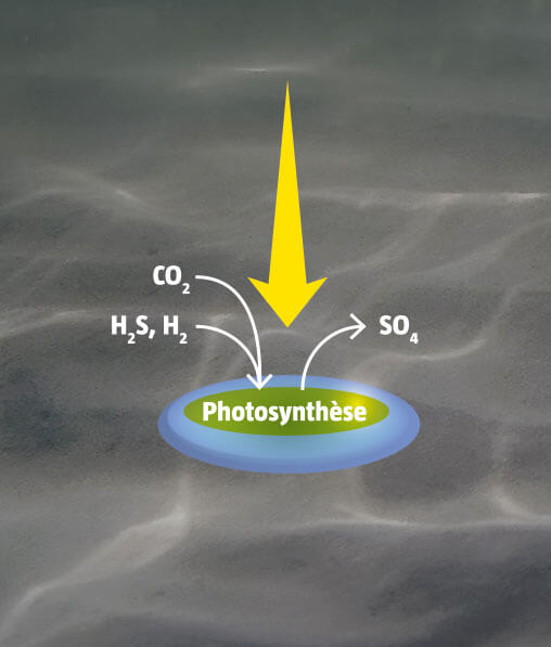 Après des centaines de millions d’années, certaines bactéries dites pourpres ou vertes apprennent à tirer parti d’une énergie pratiquement infinie : le rayonnement du soleil. Elles intègrent dans le minuscule sac qui compose leur organisme une forme primitive de chlorophylle. Excitée par le soleil, cette molécule transmet son énergie à un arsenal chimique qui fabrique des sucres à partir de CO2 et d’hydrogène ou de sulfure d’hydrogène. La photosynthèse est née, mais elle demeure sans doute rare dans les océans car dépendante de la géothermie.