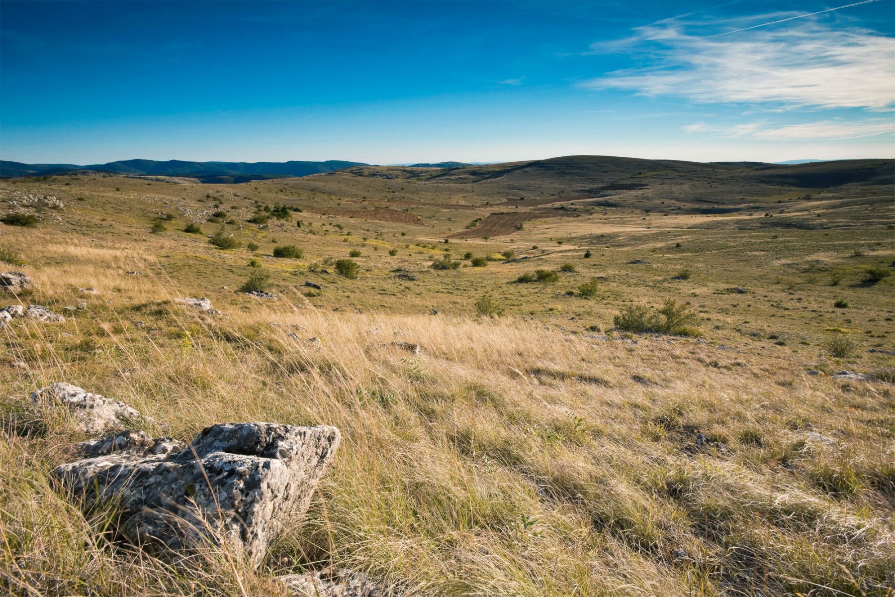 Pour atteindre le vaste plateau calcaire du Causse Méjean, il faut d’abord quitter les somptueuses Gorges de la Jonte au niveau de Meyrueis, puis sinuer sur une route accrochée à des falaises vertigineuses. Une fois là-haut, nous avons passé les 1 000 m d’altitude. La vallée encaissée a disparu, comme engloutie par une étendue infinie de pierres et d’herbes jaunies. Un bout de Lozère aux accents d’Asie centrale s’ouvre au regard et invite à une marche ravigotante. En avant !