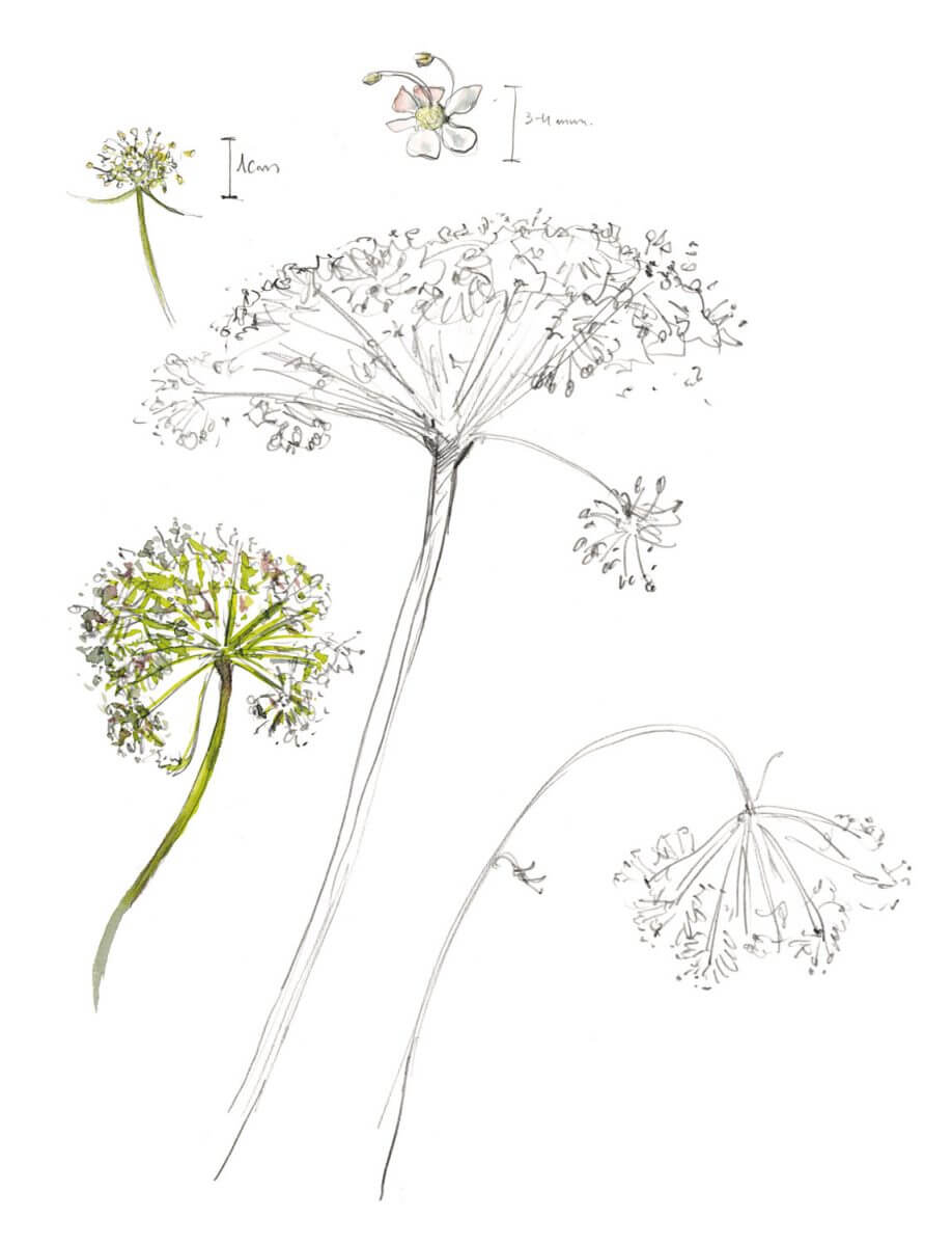 Et la cressonnière ? Quelle nouvelle plante y aura donc pris le dessus ? Cette fois-ci, nous sommes accueillis par quelques mâts gigantesques dominant le commun des laîches et des orties. Ici, les angéliques ont atteint des proportions monstrueuses. La plus grande d’entre elles, haute de presque deux mètres cinquante, s’est écroulée sous son propre poids. On admire à la loupe la délicate architecture de ses rayons duveteux, ainsi que ses petites fleurs blanches allègrement broutées par mille insectes menus.