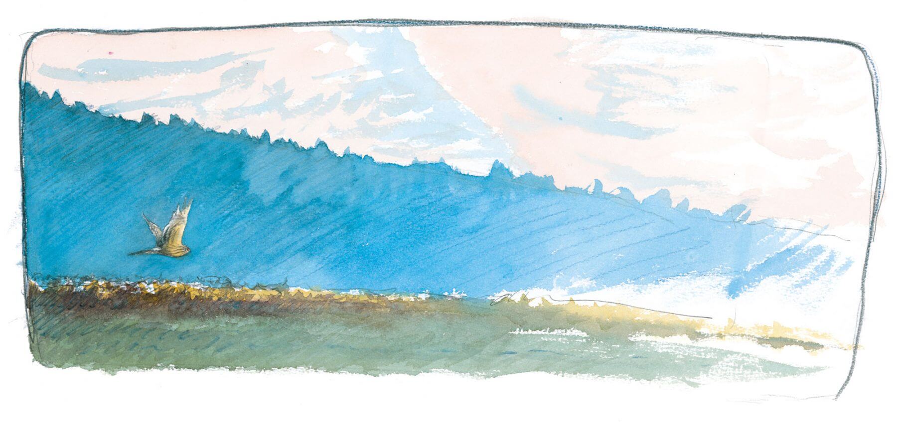 Encore cinq cents mètres au milieu des champs et nous serons en forêt. Et là, soudain, sur notre droite, un rapace en poursuit un autre plus petit qui tient une proie dans ses serres. Devant, le faucon crécerelle s’esquive. Derrière, c’est un… busard Saint-Martin ! Le poursuivant renonce, repasse devant les sommets enneigés, louvoie, hésite en rase-mottes entre vols battus et parfois planés, pour se poser finalement dans l’herbe. Le soleil se lève à cet instant précis, illuminant son iris jaune. Un second busard passe tout près tandis que le premier capture un long ver de terre.
