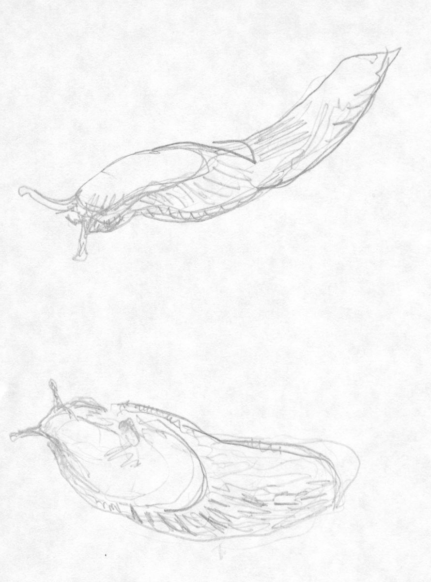 Le ballet des nuages stimule et inspire le mouvement d’animaux luisants, souples et colorés : les limaces. Ce matin, elles fascinent Laurent, notre dessinateur ! Voici les mollusques maudits du jardin devenus acrobates, passant d’herbe en herbe, longeant avec grâce les tiges et les feuilles, épousant leurs courbes. Agenouillez-vous un jour de pluie, vous pourrez contempler au ras du sol leurs ballets luisants et baveux, sauvages en diable.