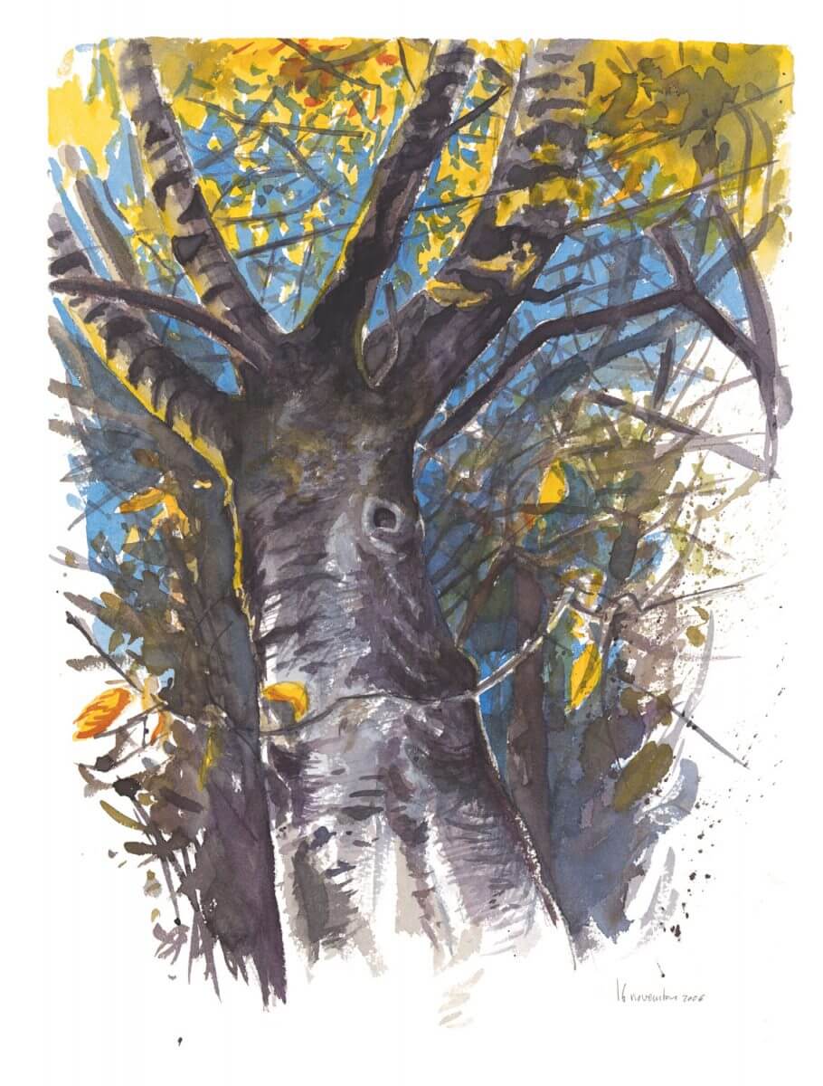 Le grand bouleau agite ses feuilles jaunes dans le ciel bleu. Depuis longtemps, son écorce racornie n’a plus la finesse et la délicatesse du papier. C’est une vieille peau blanche, grise et noire, épaisse et rugueuse, qui dans la litière humide survivra longtemps à la décomposition de son bois.
