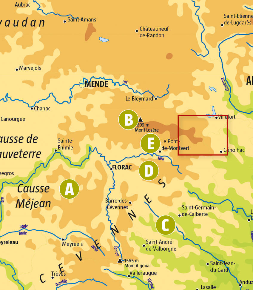 B) Les sources du Tarn Au pied du mont Lozère, versant sud, coulent paisiblement et abondamment les sources du Tarn. Une magnifique lumière s'y reflète auprès des hêtraies et le long des roches de granite clair.