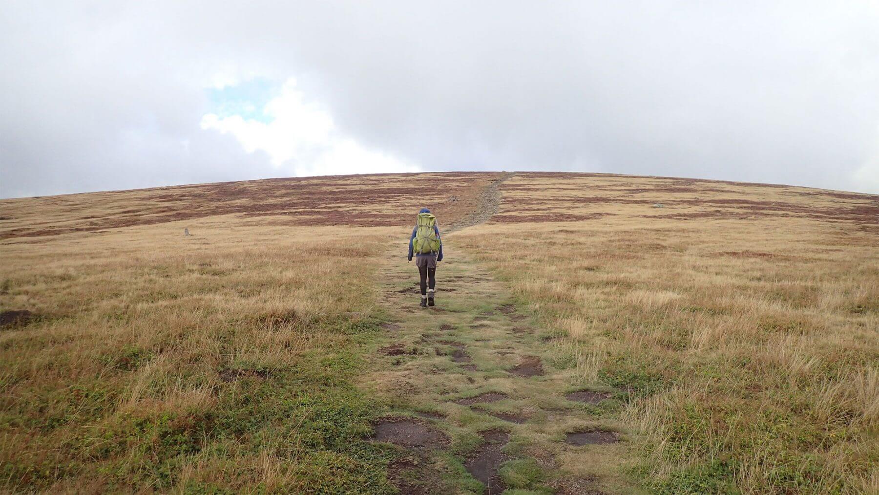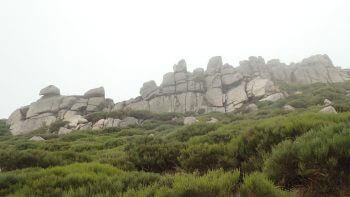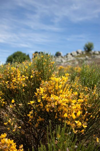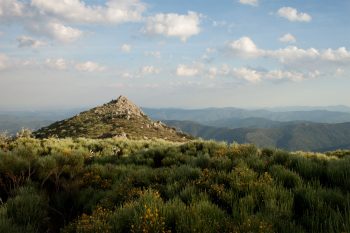Un plateau haut, une cuvette, puis la montée reprend… Deux bourgeons de pin noir en guise de bonbons pour la gorge redonnent du courage. Cette fois, le point culminant est atteint : seule l’alouette lulu pirouette plus haut. Une crête granitique accompagne le chemin qui se perd dans un océan de genêts où nagent de délicieuses myrtilles. Les buissons à hauteur d’épaule laissent admirer des collines verdoyantes qui ondulent à perte de vue en se diluant dans le bleu du ciel.