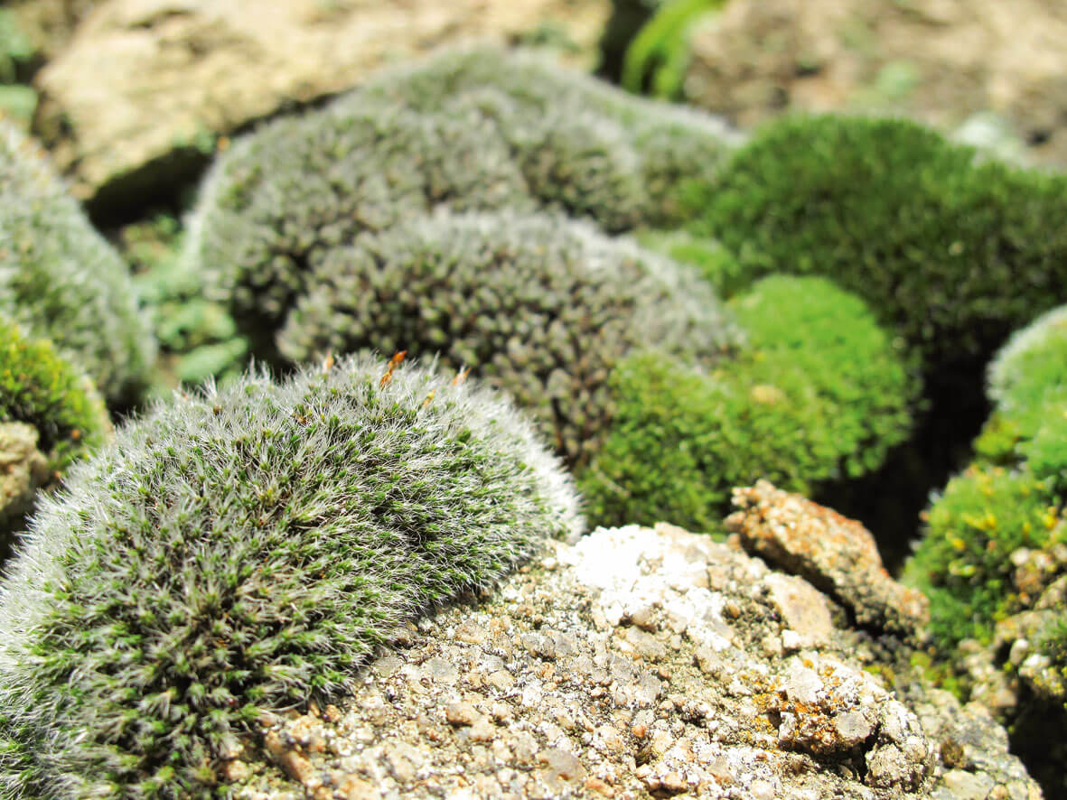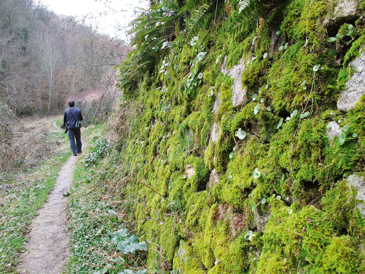 Laissons les hauteurs et la vue sur le fleuve pour nous glisser dans le ravin de l'Arbuel. Dans ce musée à ciel ouvert, des œuvres en camaïeu de vert s'étalent sur les vieux murs de pierres sèches. Des mousses du genre Grimmia poussent sur la roche en formant d'esthétiques coussinets. A leurs côtés, les nombrils-de-Vénus aux feuilles rondes et épaisses ne sont pas encore parés de leurs fleurs mais exhibent déjà un ombilic sans pudeur.