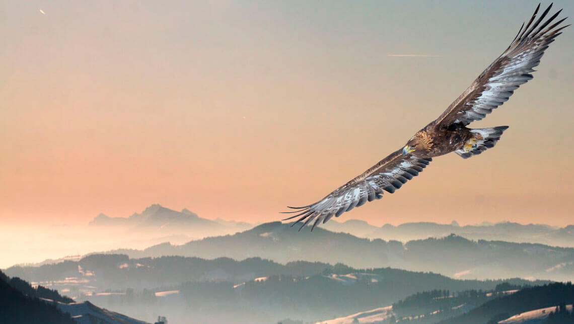 Rapide et discrète, une ombre volante se faufile avec grande agilité entre les arolles saupoudrés de neige. Des grives s'envolent en criant. Panique. Le rapace passe et repasse. Il tournoie lentement au-dessus de la cembraie, en levant deux cassenoix. Lorsqu'il vire dans la brume, sa queue blanche bordée de noir et ses claires cocardes sous les ailes apparaissent comme des armoiries. Né sept mois plus tôt à 11 km de là, le jeune aigle doré survole pelouses, névés, crêtes et pierriers. Il explore le relief à la recherche d'une proie ou d'une charogne. Toujours furtivement, afin de ne pas se faire surprendre par des aigles nicheurs qui essayeraient de le tuer pour défendre leur territoire.