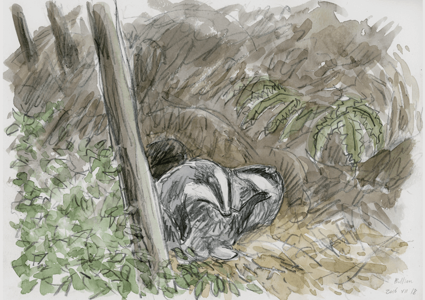 Le crépuscule arrive, et je vois surgir d’un trou une tête noire et blanche. Un blaireau de belle corpulence, probablement un mâle. Tout doucement, il se montre entièrement et flaire un instant les alentours. Puis il s'occupe de sa fourrure, probablement pour se débarrasser des puces et des tiques. Un autre plus fin sort aussi, la femelle sûrement. Elle se toilette aussi avant de s'occuper du mâle dans un soin mutuel très actif durant lequel elle le mordille et le gratte sans réserve. Ils sont tellement entrelacés que je n'arrive plus à distinguer qui est où. Un quart d’heure plus tard, ils remontent la pente et se dirigent vers un étang derrière la forêt pour chasser. Le soleil se couche et donne à la scène une monochromie saluée par les cris de la hulotte. »