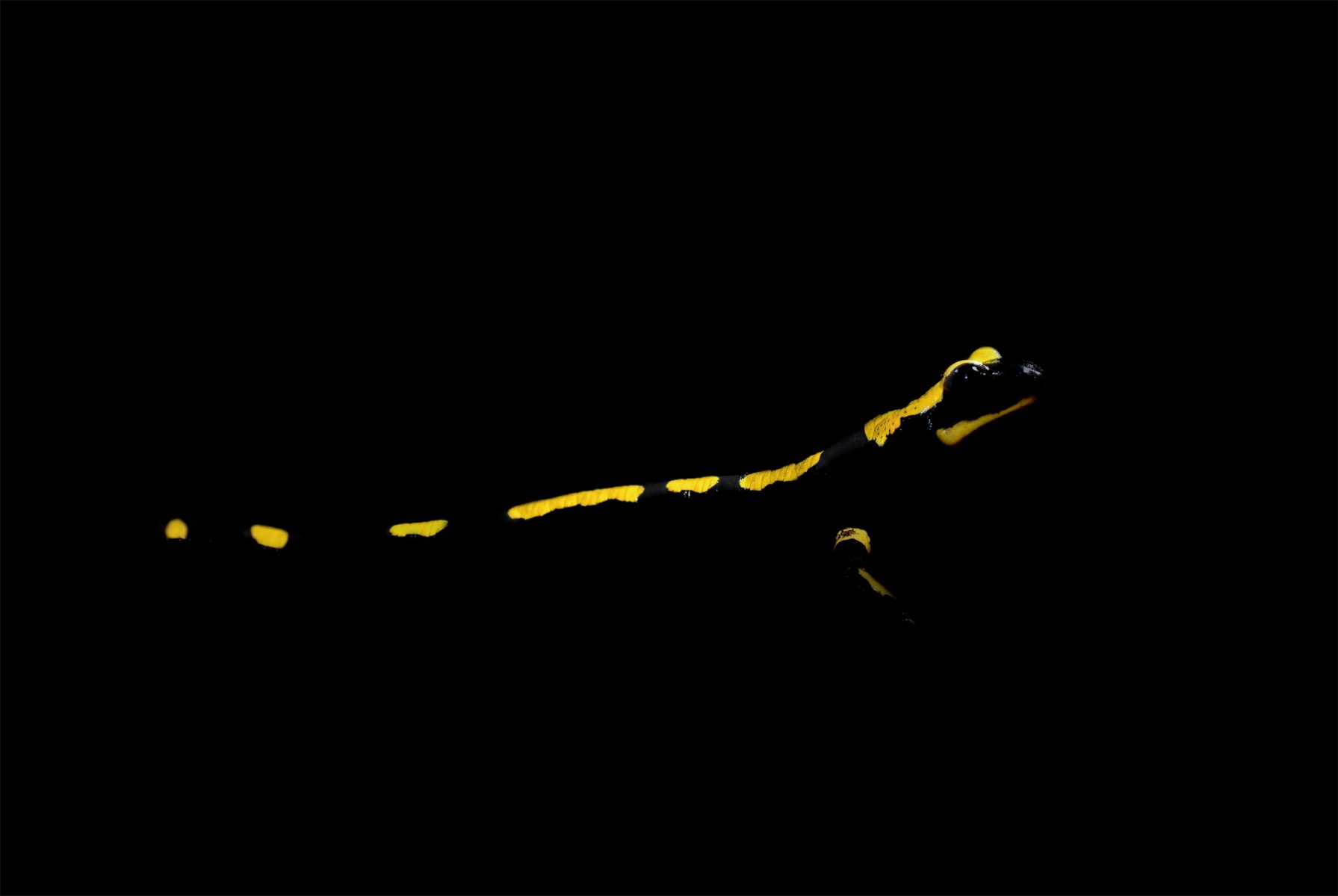 Là, il y en a une ! Mon cœur fait un bond dans ma poitrine… comme à chacune de nos retrouvailles. A côté de la grande souche se tient un animal tout bonnement magique. D'abord, son entrée en scène est toujours soudaine, mystérieuse, alors que c'est une créature lente et tranquille. Et puis, ses couleurs sont uniques. Flammes jaunes sur nuit de jais, n'est-ce pas le contraste le plus extrême qui soit donné à nos yeux ? Vue de près, la salamandre offre un énigmatique sourire de Joconde. Elle avance lentement par terre, à la merci d'un coup de botte, métaphore de toutes ces espèces écrabouillées par l'espèce humaine. Ses yeux noirs me renvoient l'image d'un bipède imprudent apprenti sorcier.