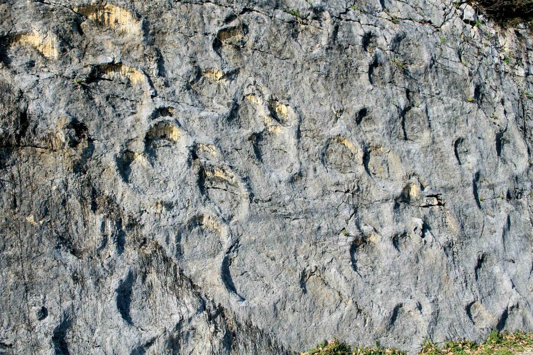B) Traces de dinosaures à Coisia Une centaine d'empreintes de pattes de dinosaures datant de 148 millions d'années sont visibles dans une roche du jurassique supérieur le long de la route D60E entre Coisia et Thoirette. Ces Parabrontopodus , des herbivores proches des Diplodocus, mesuraient entre 27 et 32 mètres de long.