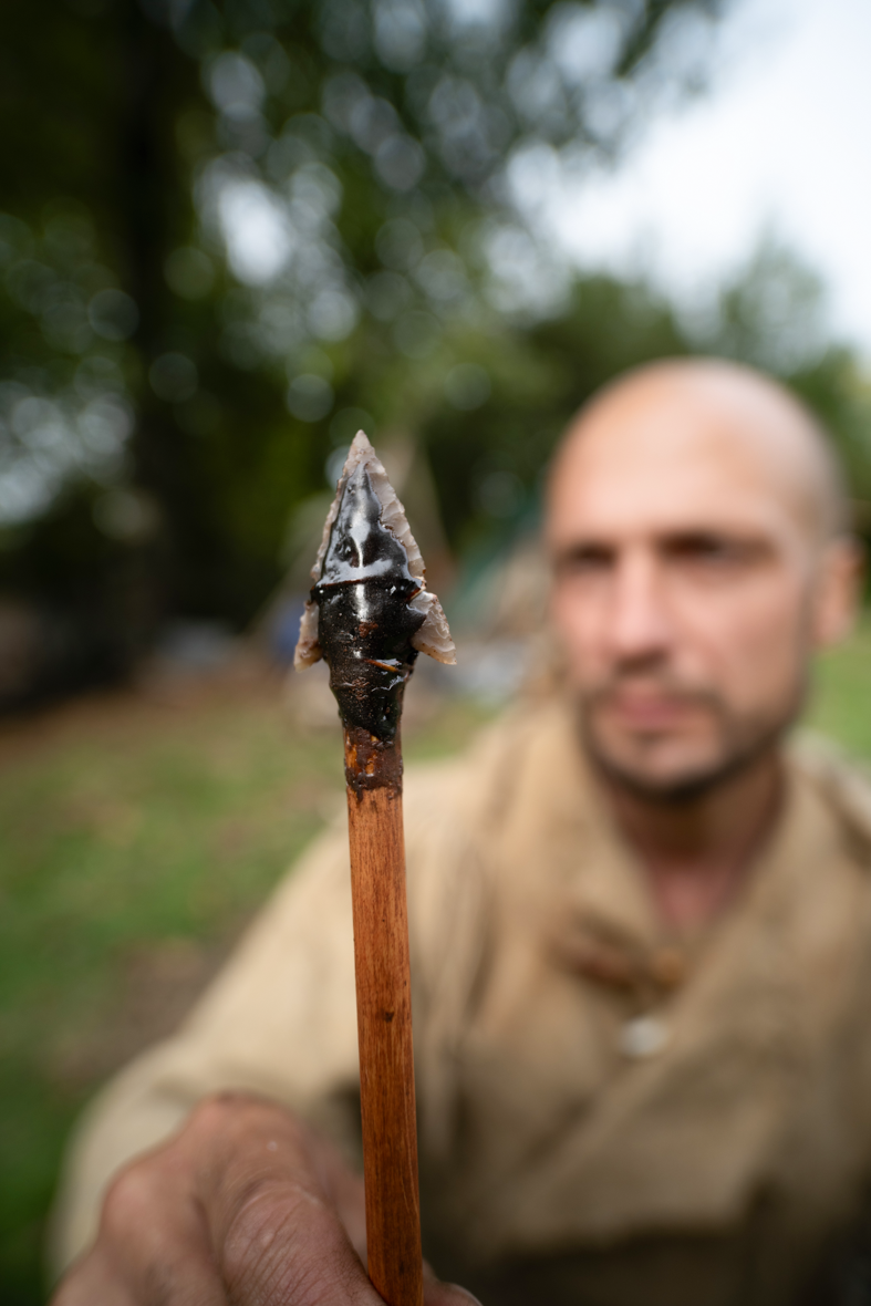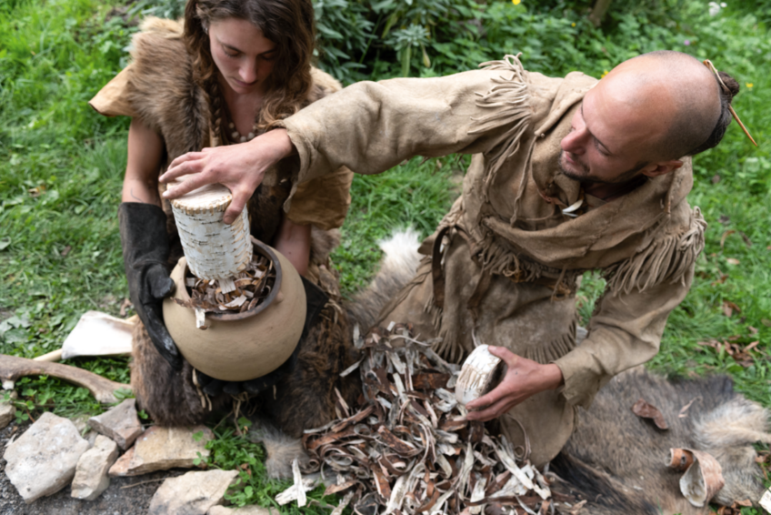 Retour au foyer éteint. Les expérimentateurs soulèvent la grande jarre. « Ouaaah ! » Dans le creuset encore fumant, une flaque noire d’encre est née : le brai. On comprend pourquoi le bouleau – Betu en gaulois – a donné son nom au bitume, mais la parenté avec l’asphalte de nos rues reste sémantique. « C’est quand même mystérieux, le noir qui est extrait du blanc », songe Lara. Plus prosaïquement, c’est la pyrolyse : par la chaleur et en l’absence d’oxygène dans la chambre en céramique, les écorces claires se sont partiellement liquéfiées en goudron aromatique. Giovanni saisit le pot de colle et y ajoute une part égale de résine, qui fait office de durcissant. Sous un rayon de soleil apaisant, accompagné par le doux chant de bouvreuils, il applique la masse visqueuse à l’aide d’un bâton sur une pointe de flèche en silex qu’il a ligaturée à une hampe de bois. En plus d’emmancher des outils, ce goudron servait aussi à recoller la poterie cassée. Pour les deux artisans, ce mélange a « l’odeur de la Préhistoire ». En 2023, des recherches ont démontré que la fabrication du brai de bouleau a débuté par Néandertal il y a 200 000 ans… bien avant Ötzi. Certains archéologues avancent que cette matière – paraît-il aussi adhérente que les colles bicomposants modernes – est la substance de synthèse la plus ancienne jamais fabriquée par un hominidé. Un procédé qui nécessite des capacités cognitives avancées, qu’on pensait être l’apanage de sapiens…