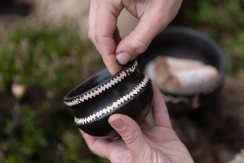 Après le façonnage et le séchage, elle a réalisé une cuisson au feu de bois, en atmosphère privée d’oxygène pour la couleur noire. Est venue ensuite la découpe de l’écorce blanche à l’aide d’un scalpel de silex. « L’ancêtre du découpage du papier ? », s’amuse Lara en référence à la tradition helvétique. Les reconstituteurs ont dû se mettre à deux pour le laborieux collage des décors. De toute évidence, ces poteries fines, qui ne peuvent ni se mettre sur le feu ni passer l’épreuve de la vaisselle, ont eu une fonction spéciale. Plats de fête, cadeaux de mariage, objets rituels ? Mystère.