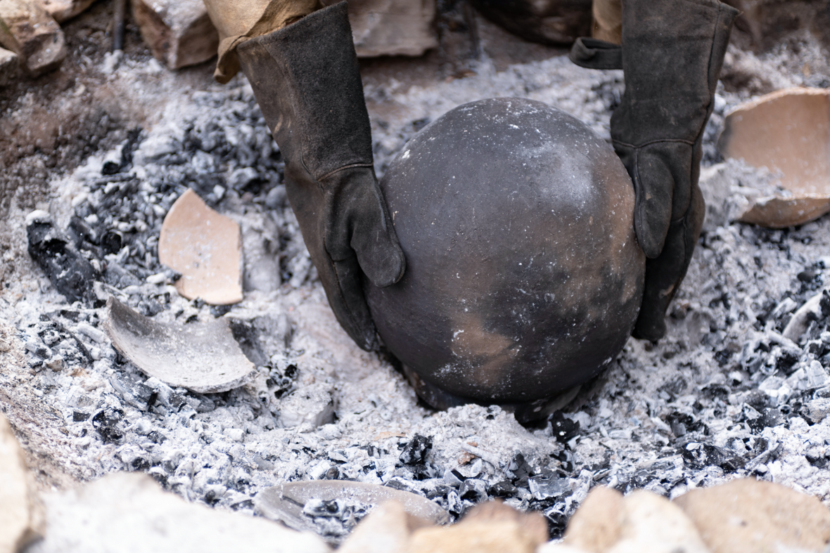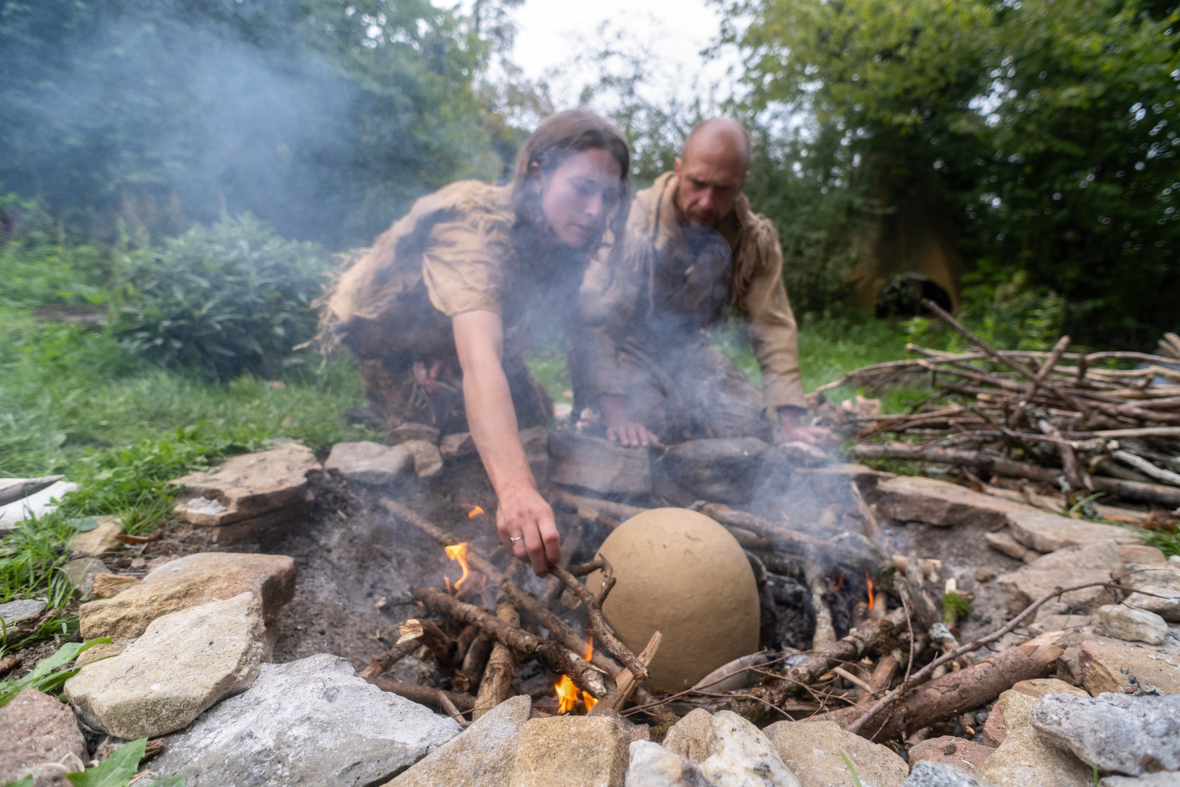 En parlant collage, comment faisaient nos aïeux sans gel instantané extra-fort ? Démonstration ! Au centre du jardin, le foyer préchauffé toute la matinée accueille désormais en son centre excavé un petit pot en terre cuite surmonté d’un grand couvercle percé. Le couple d’artisans bourre des lanières d’écorce de bouleau dans une jarre en argile née des mains de Lara, la retourne et la cale sur le couvercle qui fera office d’entonnoir. Autour de cet œuf géant est construit un nid de branchettes. Le prochain acteur entre en scène : le feu. « Il faudra une montée lente de la température en l’alimentant progressivement de bois, pour éviter tout choc thermique, puis une grosse flambée finale », explique Giovanni. Il jette dans l’âtre des déchets d’écorce blanche qui s’enflamment instantanément en dégageant une fumée âcre et noire : « C’est très pratique d’en avoir dans son kit d’allume-feu, ça fonctionne même mouillé. »
