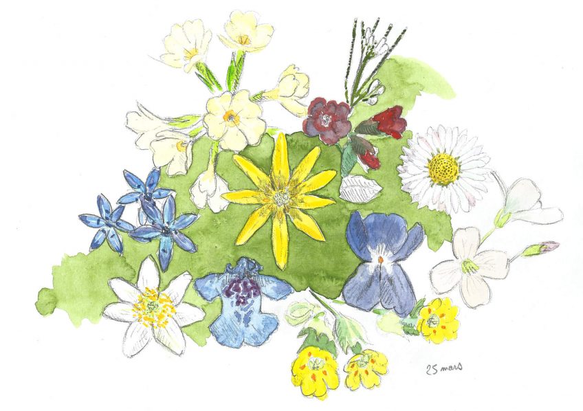 Je m'imagine alors en pollinisateur collectionneur qui veut trouver au moins dix fleurs sauvages jusqu'à la lisière du bois. Un seul pas ou plutôt un coup d'ailes me suffit pour arriver près de la primevère officinale, celle qui jaunit la campagne avant les pissenlits et que l'on surnomme coucou. Un peu plus loin, quelques violettes odorantes me permettent de goûter à la famille des Violacées. Près des vieilles pierres moussues se cache un petit personnage bleu : c'est un lierre terrestre. Cette Lamiacée n'a rien de commun avec le vrai lierre. Beaucoup plus haute que sa cousine hirsute, la cardamine des prés est en train de fleurir sous le cognassier. Déjà ? Je l'attendais en avril. Un peu à droite, classique des pelouses, la pâquerette rayonne comme toute Astéracée digne de ce nom. Encore deux mètres et voici la ficaire fausse-renoncule, ce charmant astre jaune qui annonce la lisière. Sa blanche voisine à l'ombre des frênes, Renonculacée également, porte le double prénom d'anémone sylvie. Où en suis-je ? Huit espèces, quel festival !
