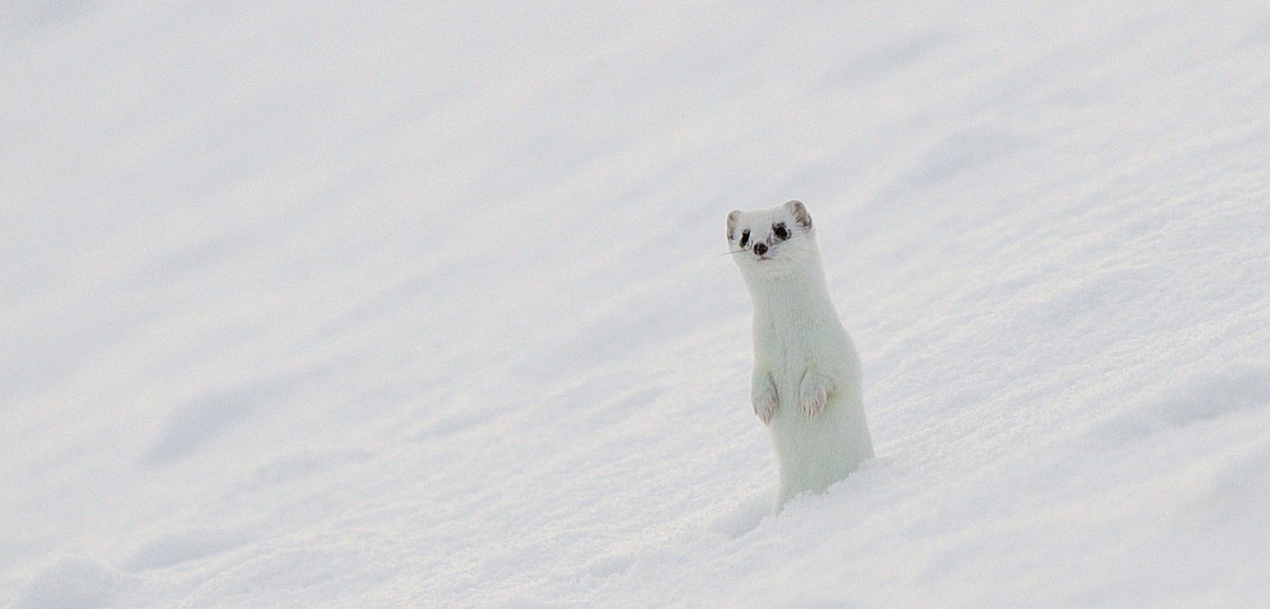 Cet hiver, la neige est abondante et permet à l'hermine de se cacher, comme le font le lagopède ou le lièvre variable. Mais quand les hivers sont plus chauds et les pâturages tout vert, l'hermine reste blanche et devient très visible. En effet, le changement de couleur n'est pas induit par la température, mais par la durée du jour. La survie de ce petit mammifère dépend donc en partie de la présence de neige et est donc menacée par le réchauffement climatique.