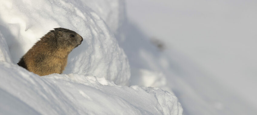 Début avril, le printemps remonte dans les alpages et la neige se retire. Au sein des terriers, les marmottes ouvrent l’œil. Et si l’une d’elles nous racontait son réveil ?