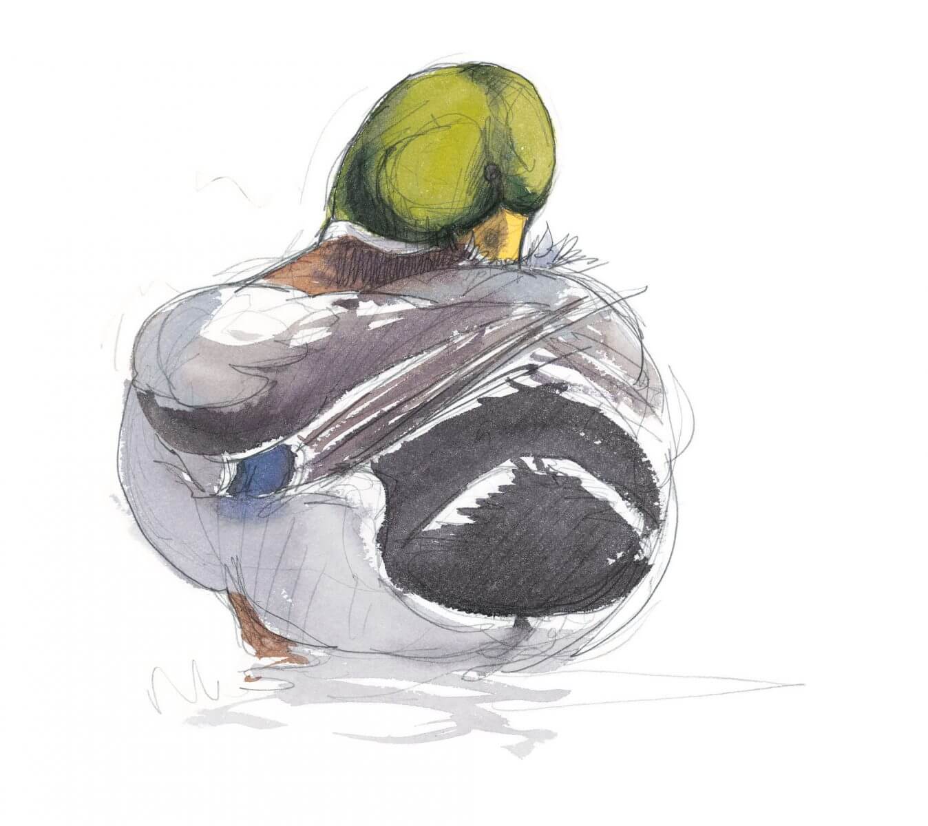 Unijambiste le colvert ? Non, les oiseaux dorment volontiers sur une patte et en profitent pour maintenir la deuxième repliée, au chaud, sous les plumes. Leur bec enfoui sous les ailes bénéficie du même confort.