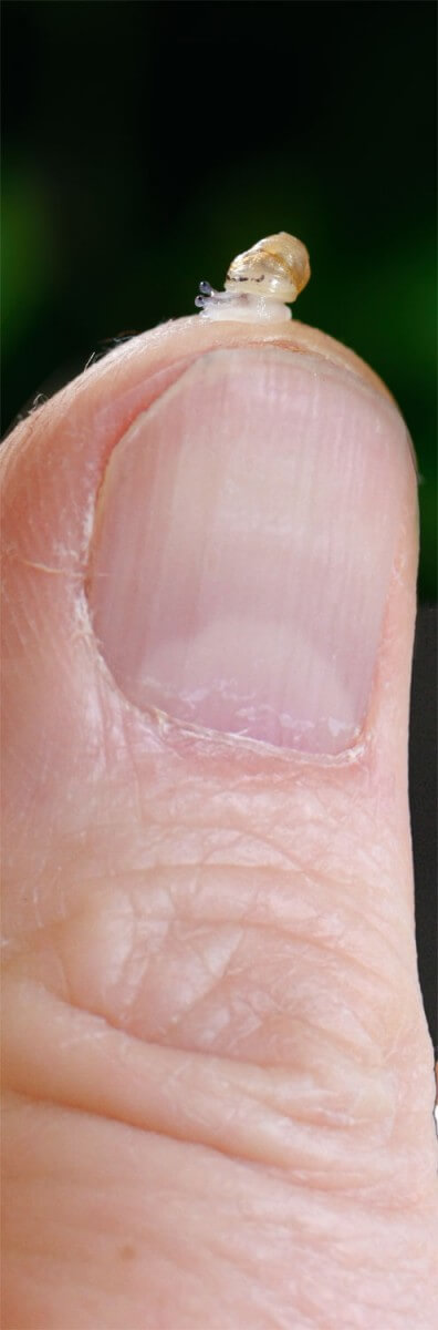 Là-haut, mauvaise surprise ! Avec une taille minuscule et une coquille molle comme du marshmallow, bébé escargot est la proie potentielle d'un nombre invraisemblable d'animaux. Il essaie de s'en tirer en vivant planqué dans la litière ou perché sur des plantes. Et surtout, il mange, il mange, il mange pour grossir au plus vite. En quatre mois, quelques rares survivants auront multiplié leur diamètre par cinq. Félicitations à ces heureux jeunes propriétaires d'un manoir à peu près sécurisé.