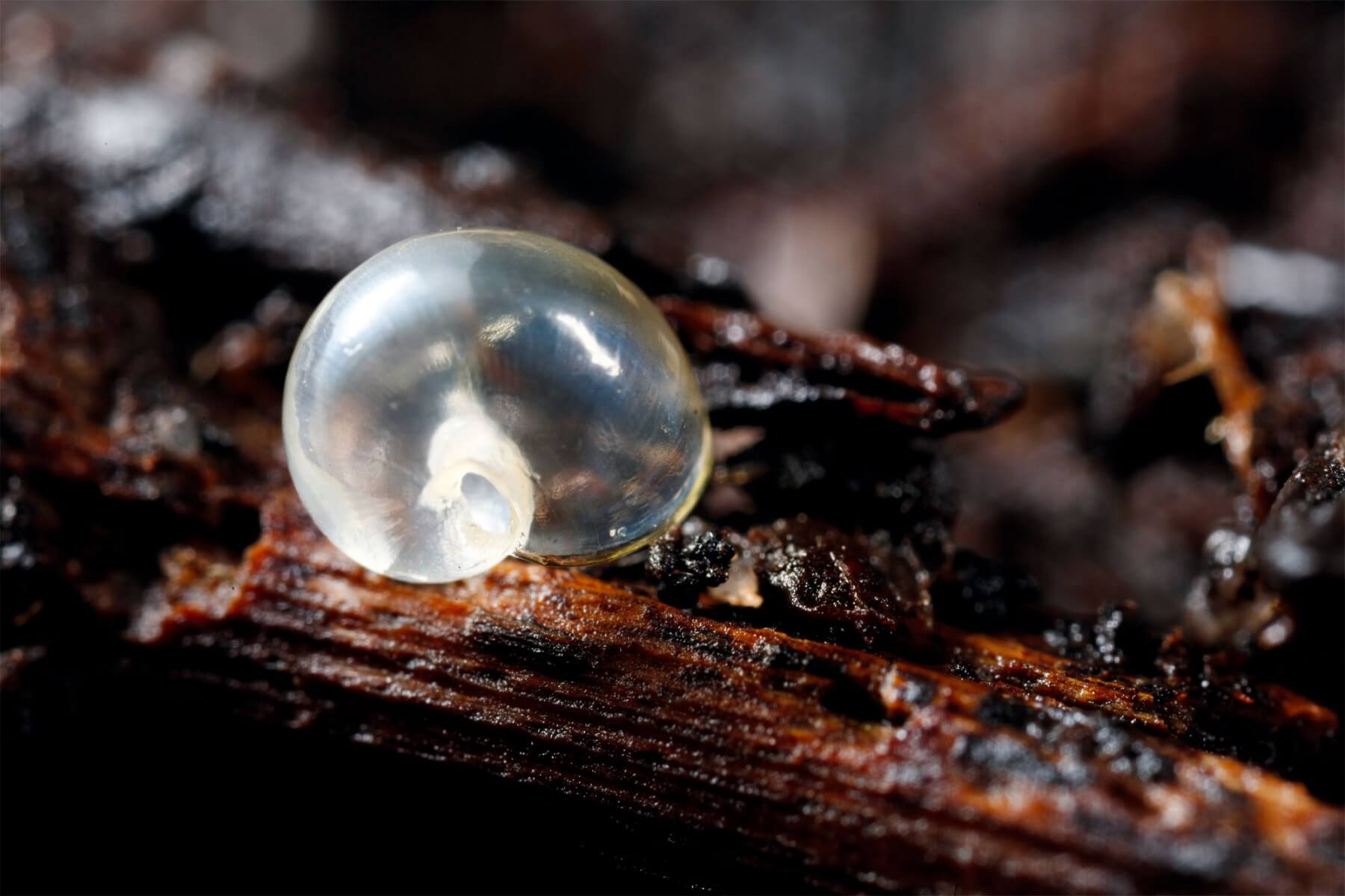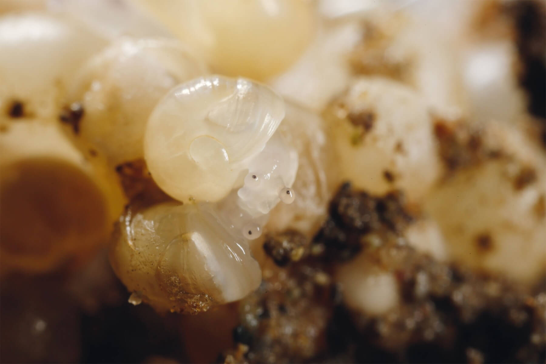 A l'abri sous terre, les petits pois blancs brunissent peu à peu. Pendant ce temps, les embryons se développent en dévorant les réserves contenues dans leur œuf. Après une à trois semaines selon la température, le grand moment est arrivé. La coquille se craquelle et bébé escargot pointe vers le monde le bout de ses tentacules. Il est entièrement translucide à part les deux canaux nerveux reliés aux yeux qui dessinent deux lignes. Sous sa coquille, on voit un petit cœur qui bat. Alors, fille ou garçon ? Les deux très certainement…