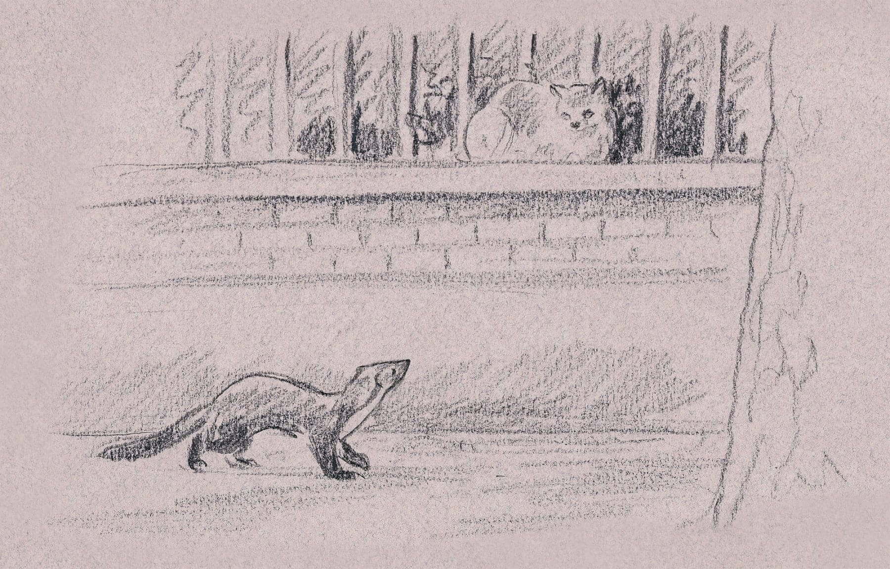 Une, puis deux fouines apparaissent sur le mur mitoyen. La première est plus large, de tête surtout : sûrement le mâle « ST » (sans tache). La seconde, plus fine, aux yeux plus grands, est la femelle « claire ». Ils descendent dans le jardin du n° 24 et grimpent chacun sur un pilier de la barrière pour s’y tenir comme deux statues.