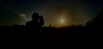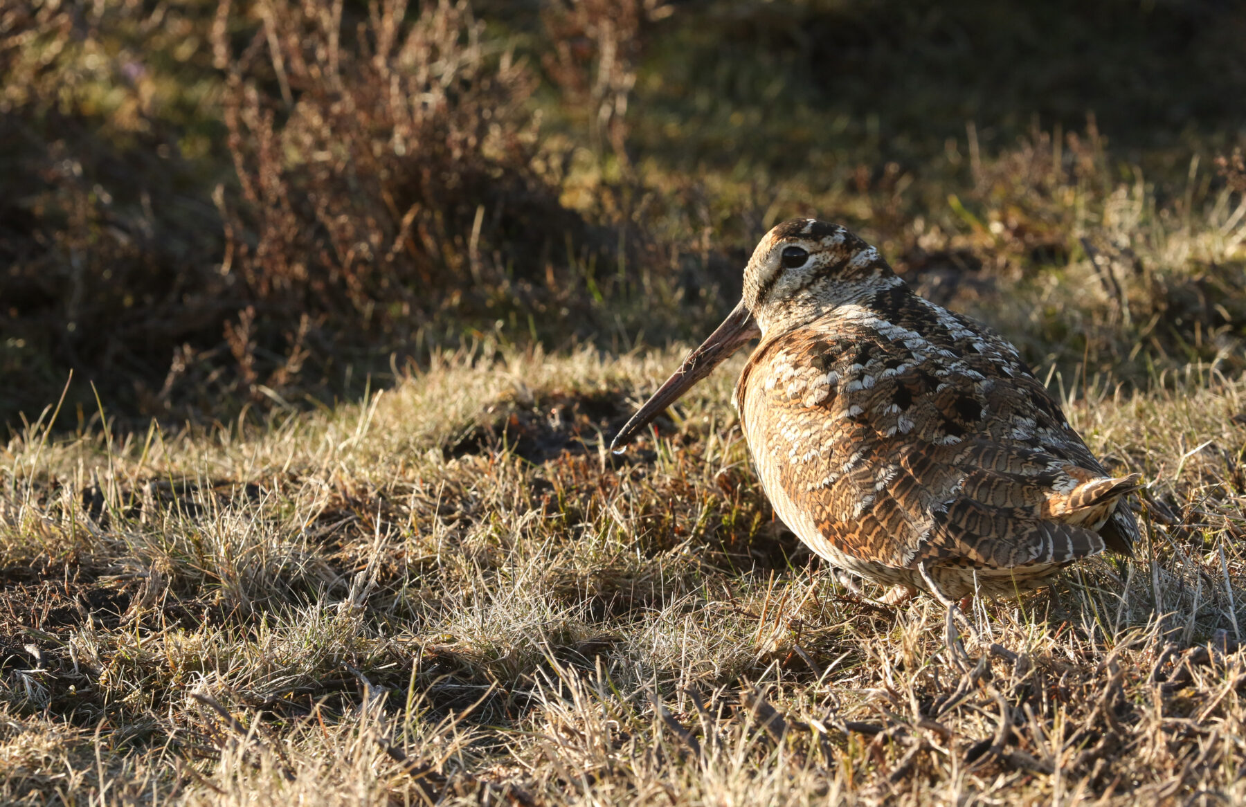 Dans ce paysage, à cette date et à cette heure-ci, je sais exactement ce que je cherche. Les premières étoiles percent, il ne reste plus qu’une grive endurante. Pour ne pas être ébloui par la lune de plus en plus fière, je guette vers l’ouest, là où le soleil diffuse encore quelques lueurs. Je balaie aux jumelles l’horizon forestier. J’alterne avec des visions larges à l’œil nu. La voilà ! Ah non, c’est une chauve-souris. Pssitt krro krrro krrro… Bingo ! La bécasse des bois surgit avec sa silhouette rondouillarde, sa vive allure et son long bec légèrement incliné. La croûle (nom donné à son cri de parade nuptiale) est certainement précipitée par la température et les hormones. L’oiseau hivernant ne nichera pas dans ce secteur de faible altitude. Peut-être vient-il de Russie…