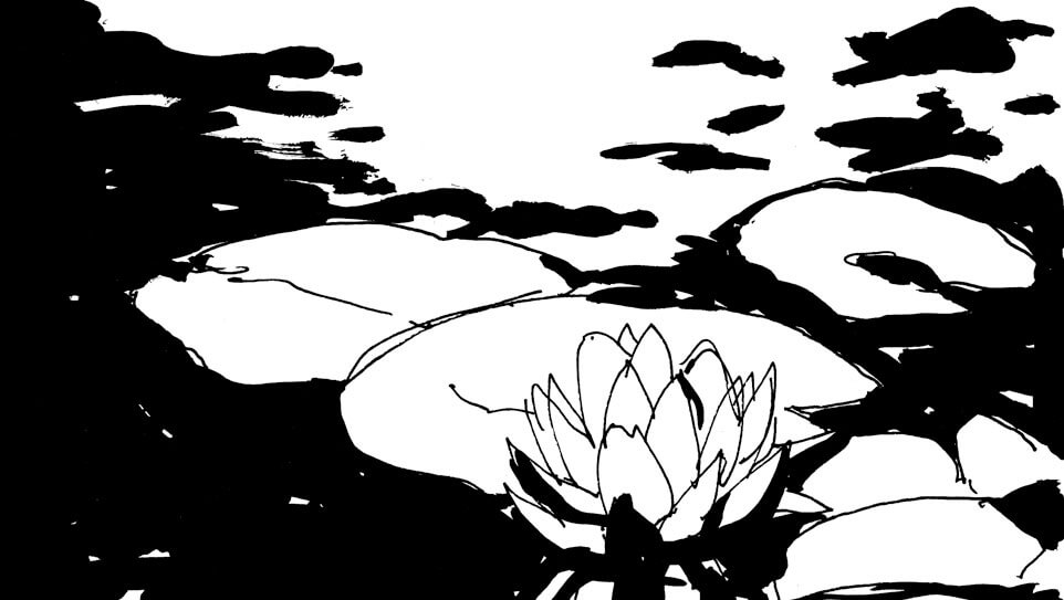 « Ces variations sur le thème du nénuphar sont liées à une exposition à l’Ile de Versailles, un jardin japonais au cœur de Nantes. Je les ai dessinées à l’encre de Chine, avec un bambou, une technique qui a libéré mon trait depuis quelques années . »