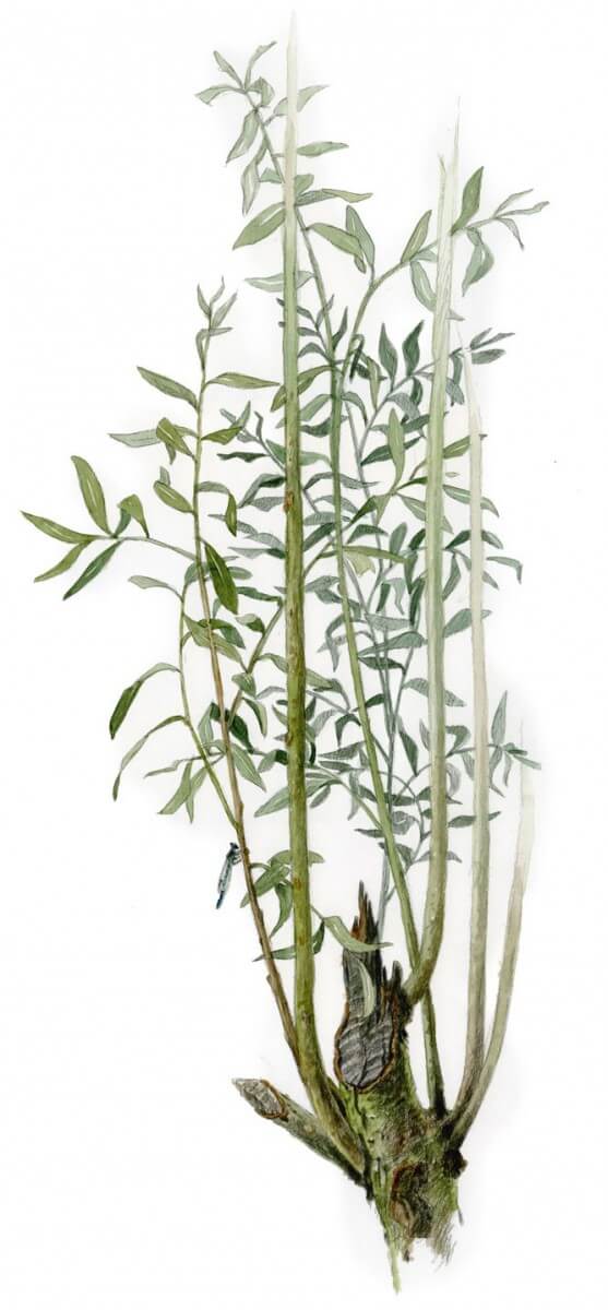 Aïe ! Quelle est cette douleur blanche ? A l'instant où je vous parle, le mâle est venu goûter à mon écorce. Reviendra-t-il un de ces jours tailler des copeaux dans mon bois ? Est-ce lui qui me fera un jour tomber dans l'eau ? Si son choix se confirme, cela sera terrible. Mais bientôt, dix rameaux vigoureux renaîtront à la base de mon tronc. Et le vieux saule usé que je suis se réincarnera en un bouquet d'arbustes vigoureux. Vous ne me croyez pas ? Alors, rendez-vous ici-même dans un ou deux étés...