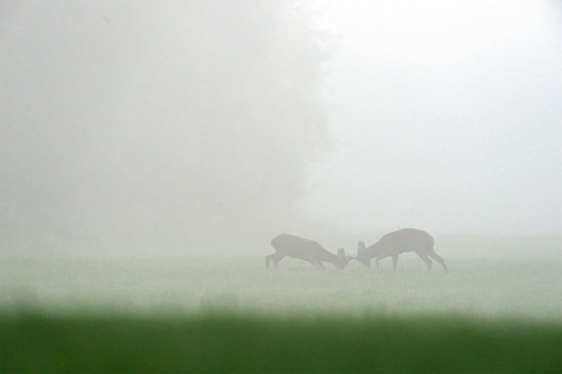 Un concurrent débarque. Sans hésiter, il approche du maître des lieux en grattant nerveusement le sol avec ses sabots sombres. Le nouveau venu semble vouloir remettre en question son autorité sous les yeux d’une belle chevrette. Face à face. Oreilles en arrière, posture dressée, menaces. Les deux rivaux s’obstinent, la tension monte encore. Les intimidations cèdent la place à un crescendo de coups de trophées. Au bout de vingt minutes, le combat se termine. Vaincu, le nouveau venu repart tenter sa chance dans d’autres friches. Encore haletant, le vainqueur recommence à talonner sa belle.