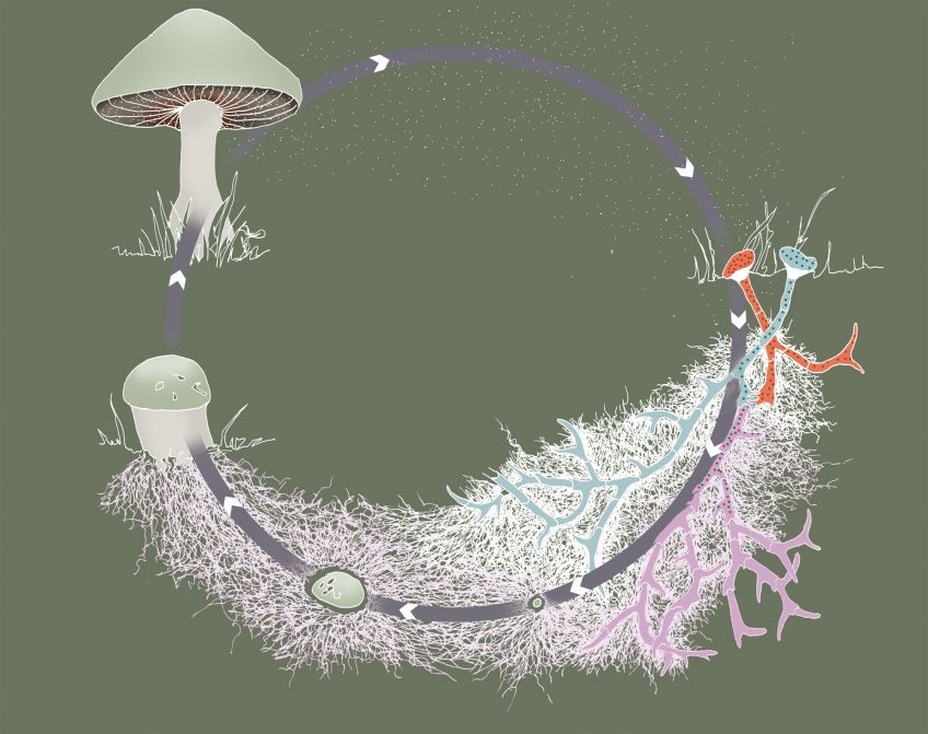 Pour germer, la spore a besoin d’un terreau riche, humide, sans concurrent ni prédateur. Elle produit de fins filaments : le mycélium primaire. Si deux de ces réseaux sexuellement compatibles se rencontrent, ils fusionnent. De cette union naît un mycélium secondaire qui contient le patrimoine génétique des deux premiers. C’est le nouveau champignon.