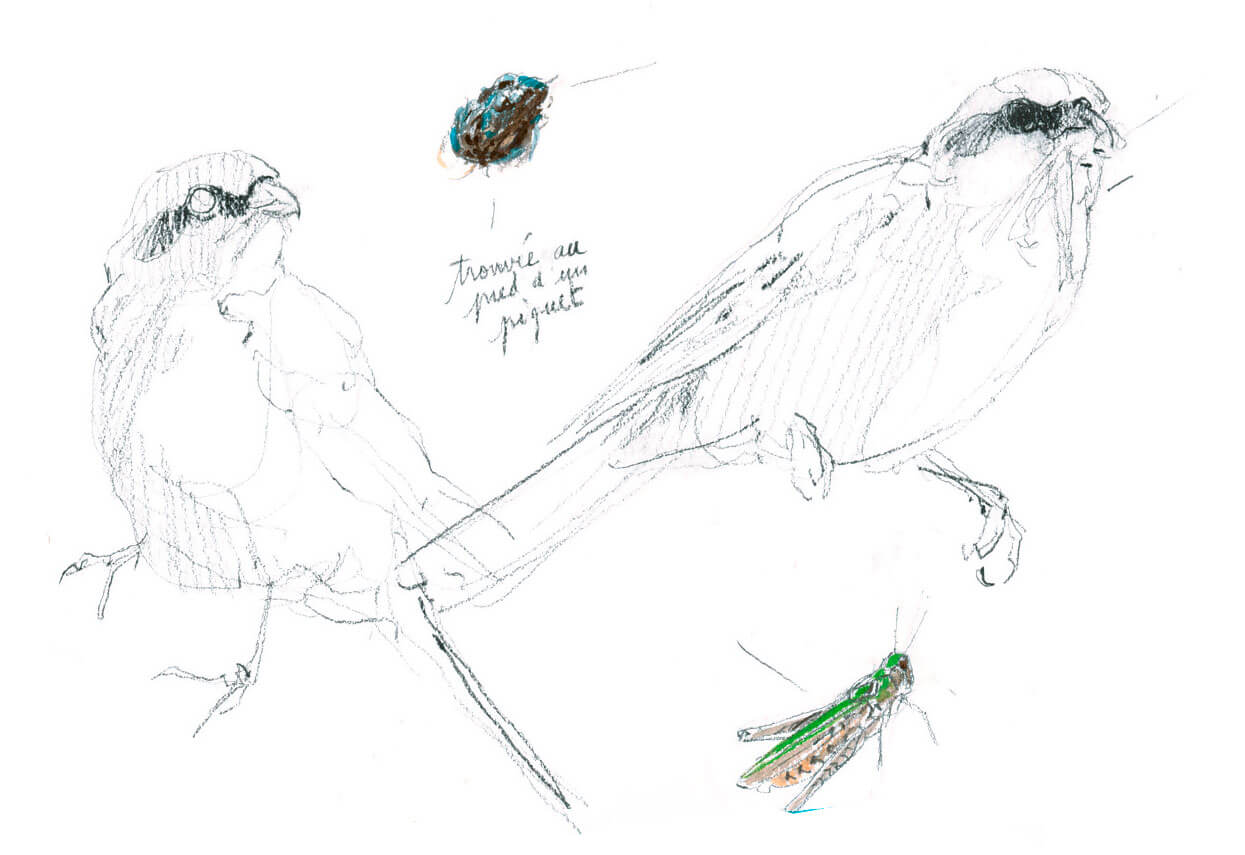 Tout comme l'année dernière, un couple de pies-grièches écorcheur a élu domicile dans un gros buisson enraciné dans l'alignement de la clôture. Aujourd'hui, les couleurs vives du mâle se détachent sur le fond vert olive de la haie d'érables champêtres. Sentinelle perchée au sommet d'une aubépine, il scrute le sol à l'affût du moindre mouvement. En contrebas, la prairie regorge de criquets. L'oiseau hyper-attentif tourne la tête tantôt à gauche, tantôt à droite, en haut, en bas... On dirait un rapace en miniature. Parfois, le corps incliné en avant, il suit du regard un hyménoptère trop rapide ou trop éloigné pour être intercepté.