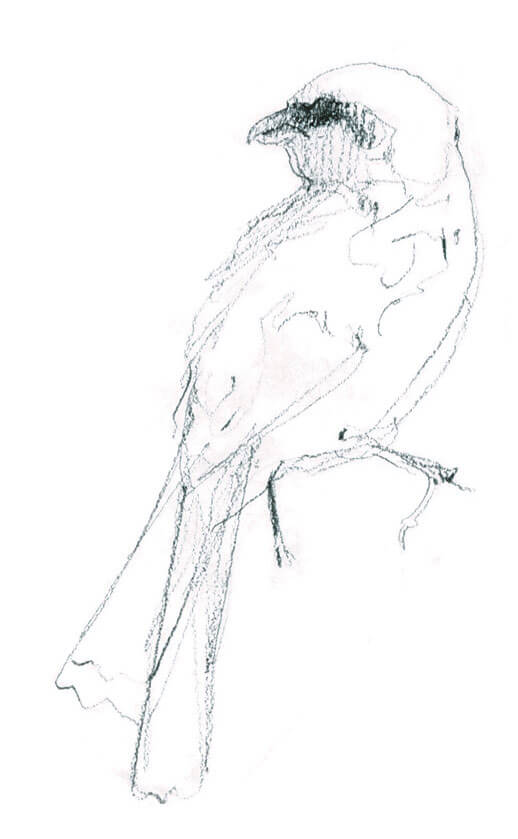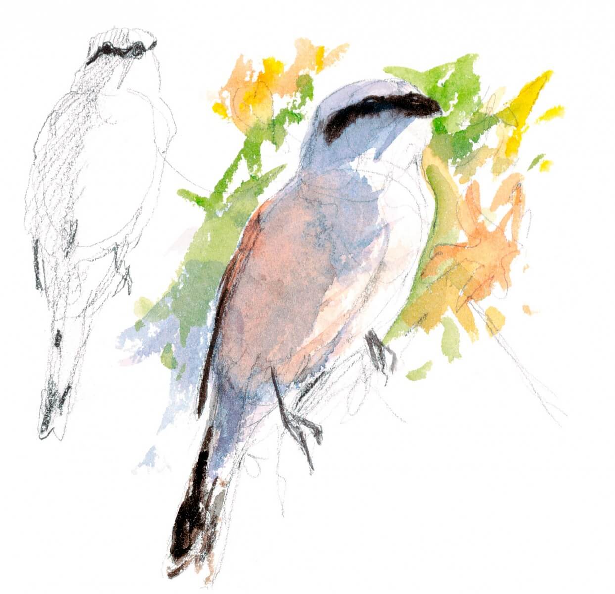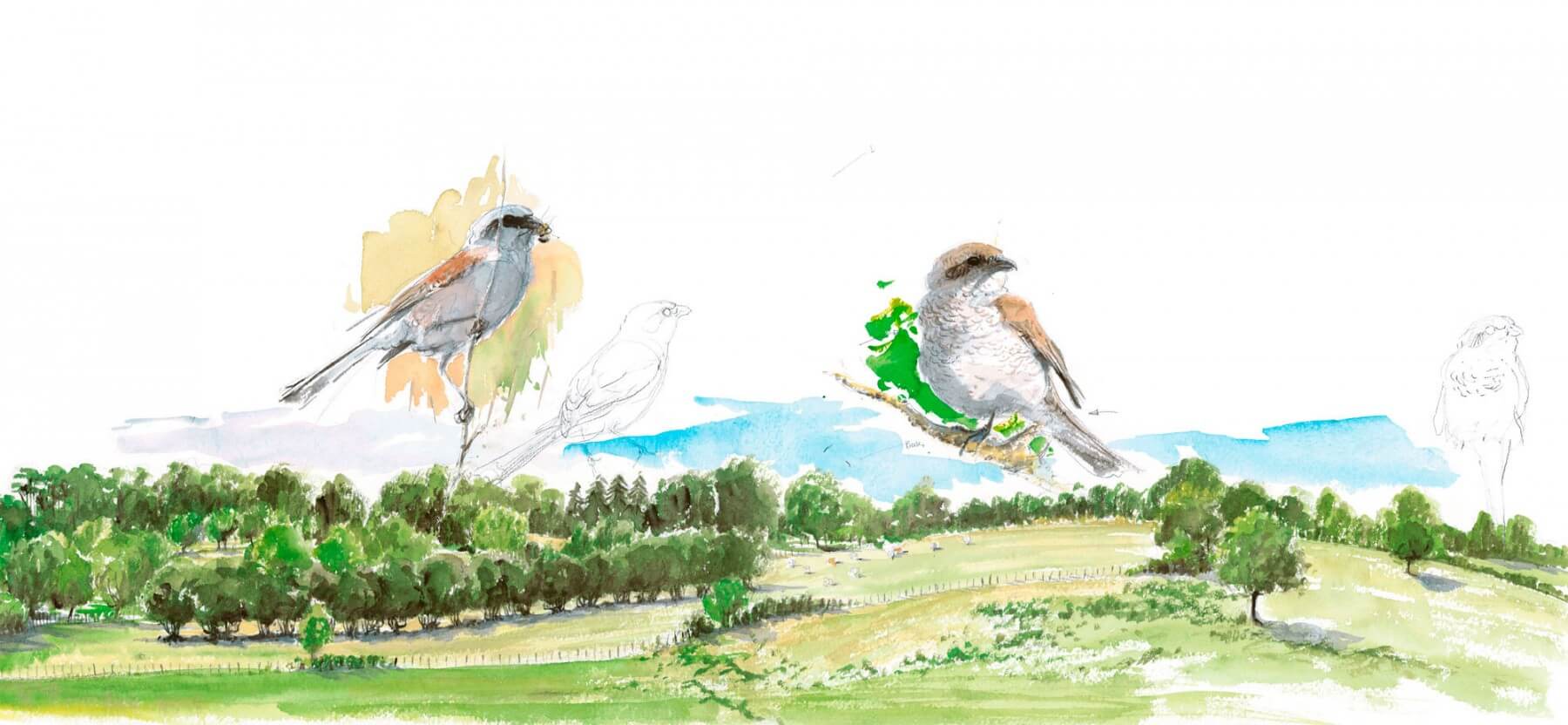 Comme sujet pour ce « Grand angle », le peintre vendéen Benoît Perrotin a choisi la pie-grièche écorcheur. Cette reine du bocage est une adepte des haies basses, touffues et riches en buissons épineux. Le prunellier, l'aubépine, l'églantier ou l'épine-vinette sont indispensables à cet oiseau pour y établir sa lardoire, un garde-manger constitué de proies empalées.