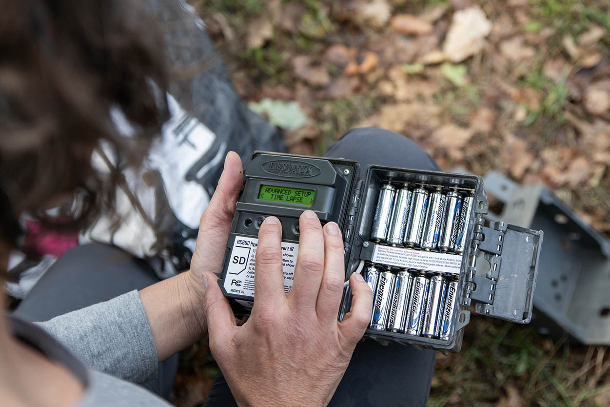 Emmanuelle paramètre le piège photo et note le point GPS de l’emplacement. Dans l’étude précédente, seuls 30 % des spécimens photographiés appartenaient à une lignée pure de chat forestier. Tous les autres étaient des individus hybrides.
