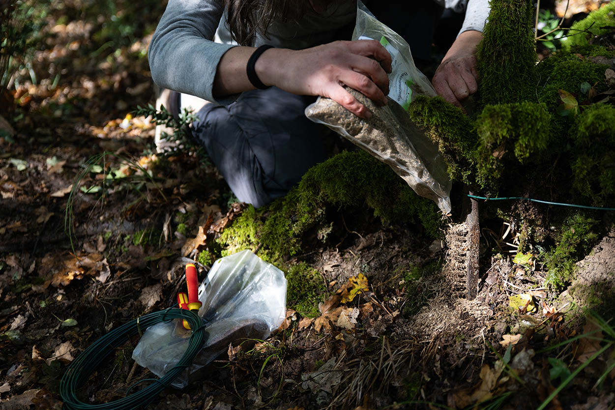 Emmanuelle s’arrête devant une coulée qui lui semble pertinente. « Je place une brosse métallique que je vais recouvrir de racines de valériane, une plante qui attire les chats forestiers », explique la scientifique en renversant un sac d’herbes-aux-chats séchées sur le dispositif. « Ils se frottent aux brosses et nous laissent des poils que l’on analyse par la suite. »