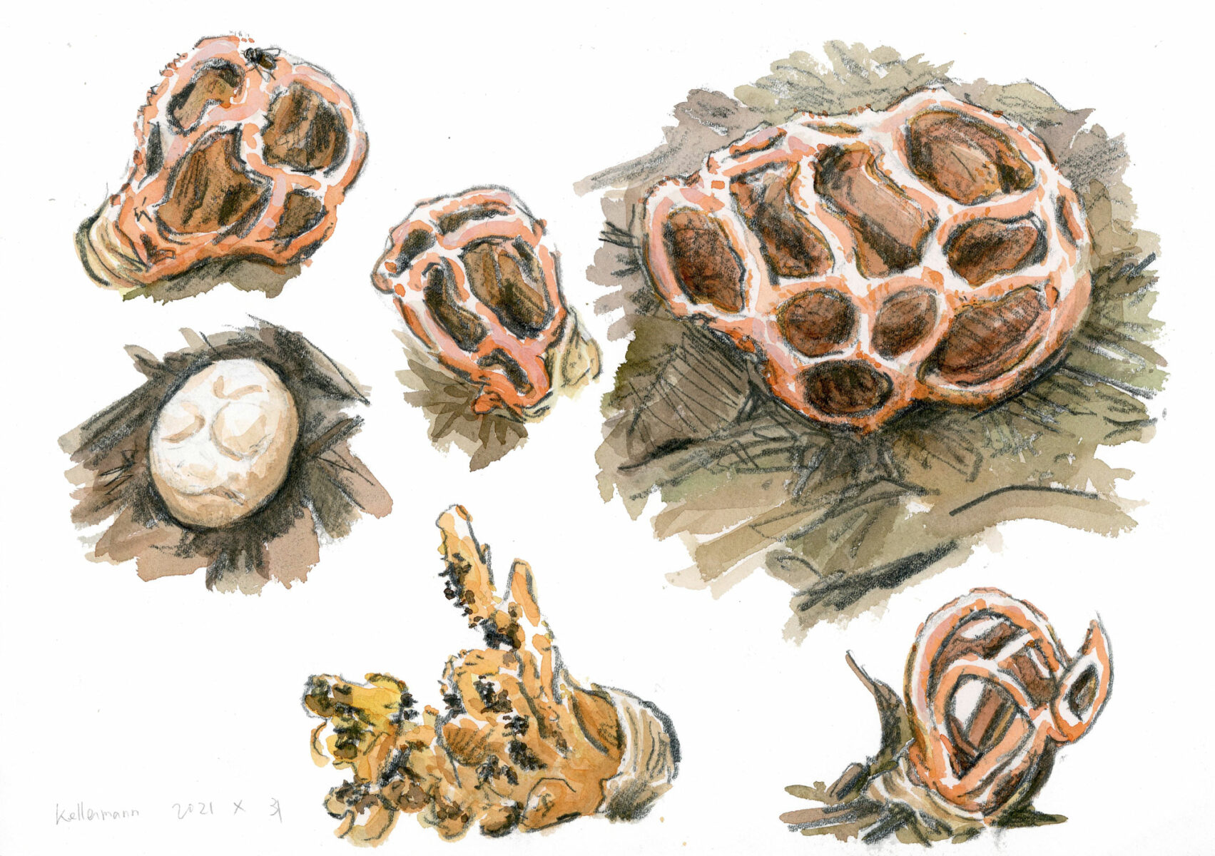 L’homme, flatté par ma réaction enthousiaste, m’a indiqué l’endroit où le trouver. Je m’y suis précipité mais les curieuses créatures étaient déjà dégradées et à peine visibles. Heureusement, j’ai remarqué deux sortes d’œufs partiellement cachés par l’humus. C’est la forme naissante des clathres. Lorsque je suis revenu un peu plus tard sur le site, une petite cage rougeâtre était déjà en formation. J’ai profité des jours suivants pour accumuler les croquis de cet alien pouvant atteindre une vingtaine de centimètres. En plus de sa forme étrange, il a la particularité de dégager une odeur putride qui attire les mouches. Grâce à ce subterfuge, le champignon assure la dissémination de ses spores par les insectes. Au dernier jour de maturation du clathre, j’ai vu s’écrouler en une sorte d’éponge celui qu’on appelle aussi cœur de sorcière ou lanterne du diable.