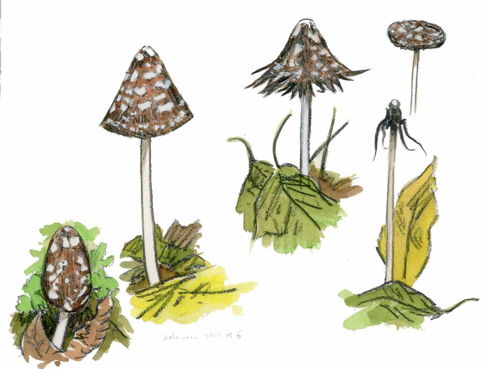 Psathyrelle, volvaire, clitocybe… ma liste de trouvailles aux noms parfois enchanteurs ne cesse de s’allonger. J’aime bien les coprins, une famille qui se caractérise par leur fragilité. Quelques heures après la maturité de ce champignon, sa chair commence à se liquéfier en une espèce d’encre de Chine. Les coprins micacé et chevelu sont probablement les plus communs. Le jour où j’ai vu un exemplaire très élancé, au pied couleur crème et au chapeau brun tacheté de blanc, je me suis dit « Bingo ! ». C’était le coprin pie, le plus beau du genre, que je ne soupçonnais pas dans Paris.