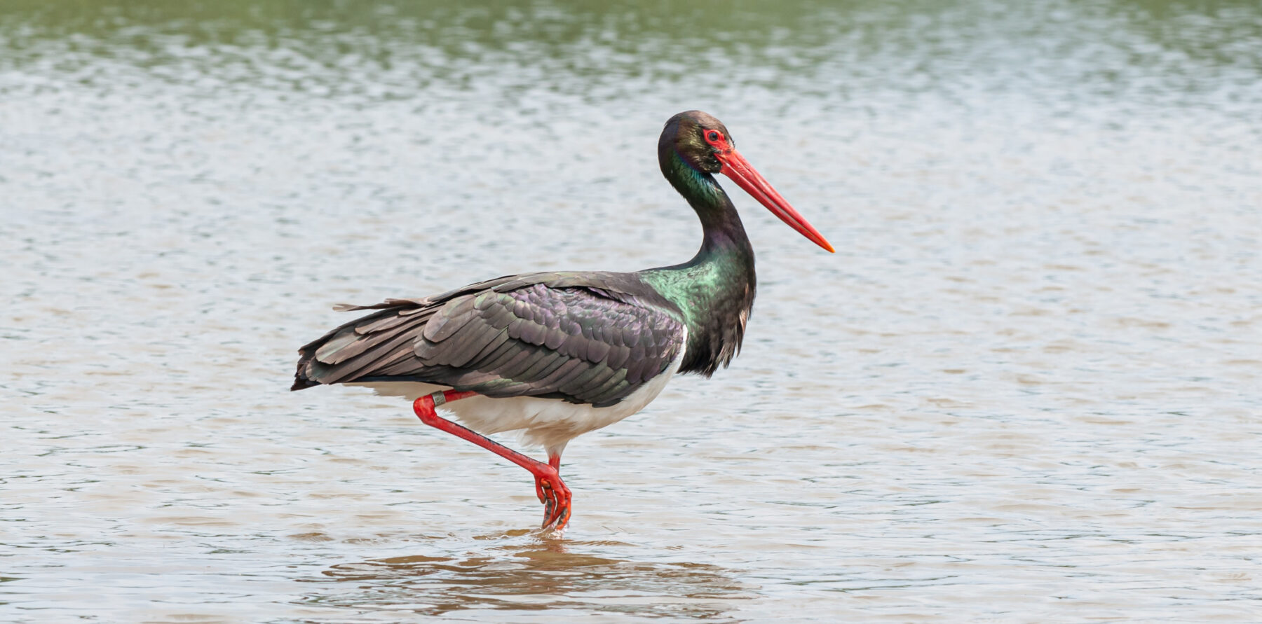 La cigogne noire a la même forme que sa cousine blanche. Seulement, c'est comme si elle avait inversé le schéma de couleur noir et blanc de la cigogne blanche. Elle troque le noir pour un vert foncé aux magnifiques reflets irisés. La rencontre est furtive et déjà l'oiseau repart ...