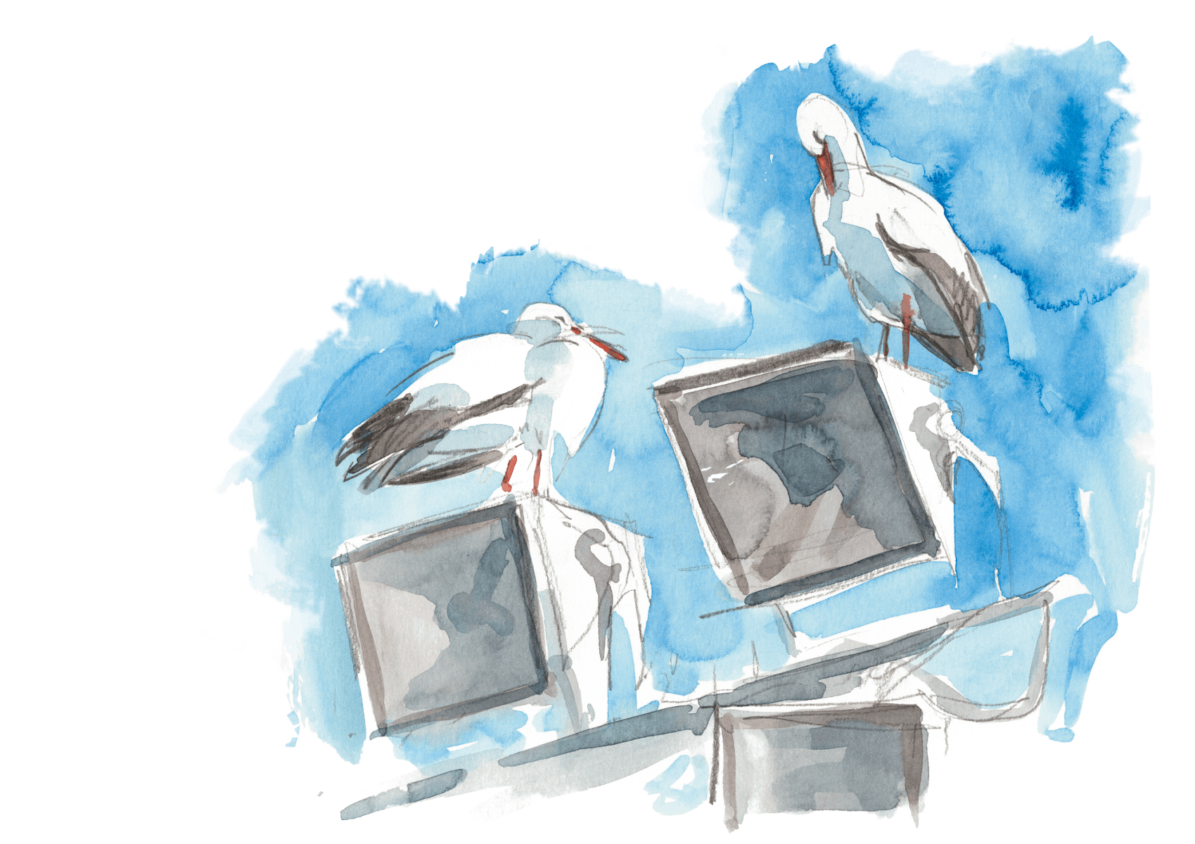 12 mars, 9 h, stade Léo Lagrange à l’ouest de Besançon. Les passants s’arrêtent net, l’index pointé vers le ciel. Stupéfaction ! Cinquante, peut-être soixante cigognes blanches ont investi les toits des immeubles du quartier, les projecteurs du terrain de sport et la grue du chantier tout proche. Un tiers d'entre elles paraissent encore endormies, souvent perchées sur une seule patte, la tête enfoncée dans leur poitrail ébouriffé. D'autres se toilettent à coups de bec minutieux. Certaines vont même jusqu'à claquer des mandibules, telles des amoureuses excitées par ce début de printemps. C’est presque l’Andalousie qui s’invite dans la vieille ville espagnole de Victor Hugo.