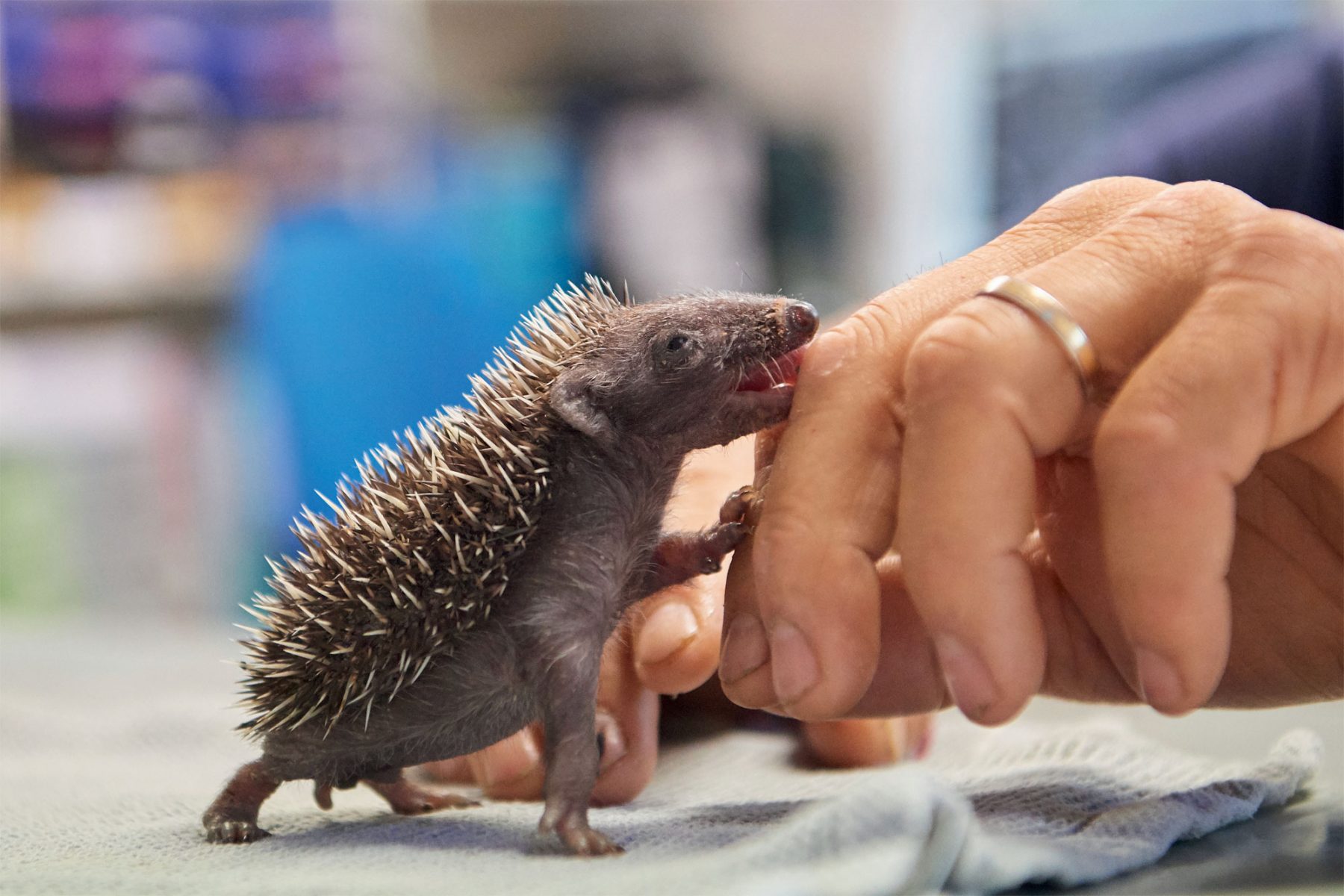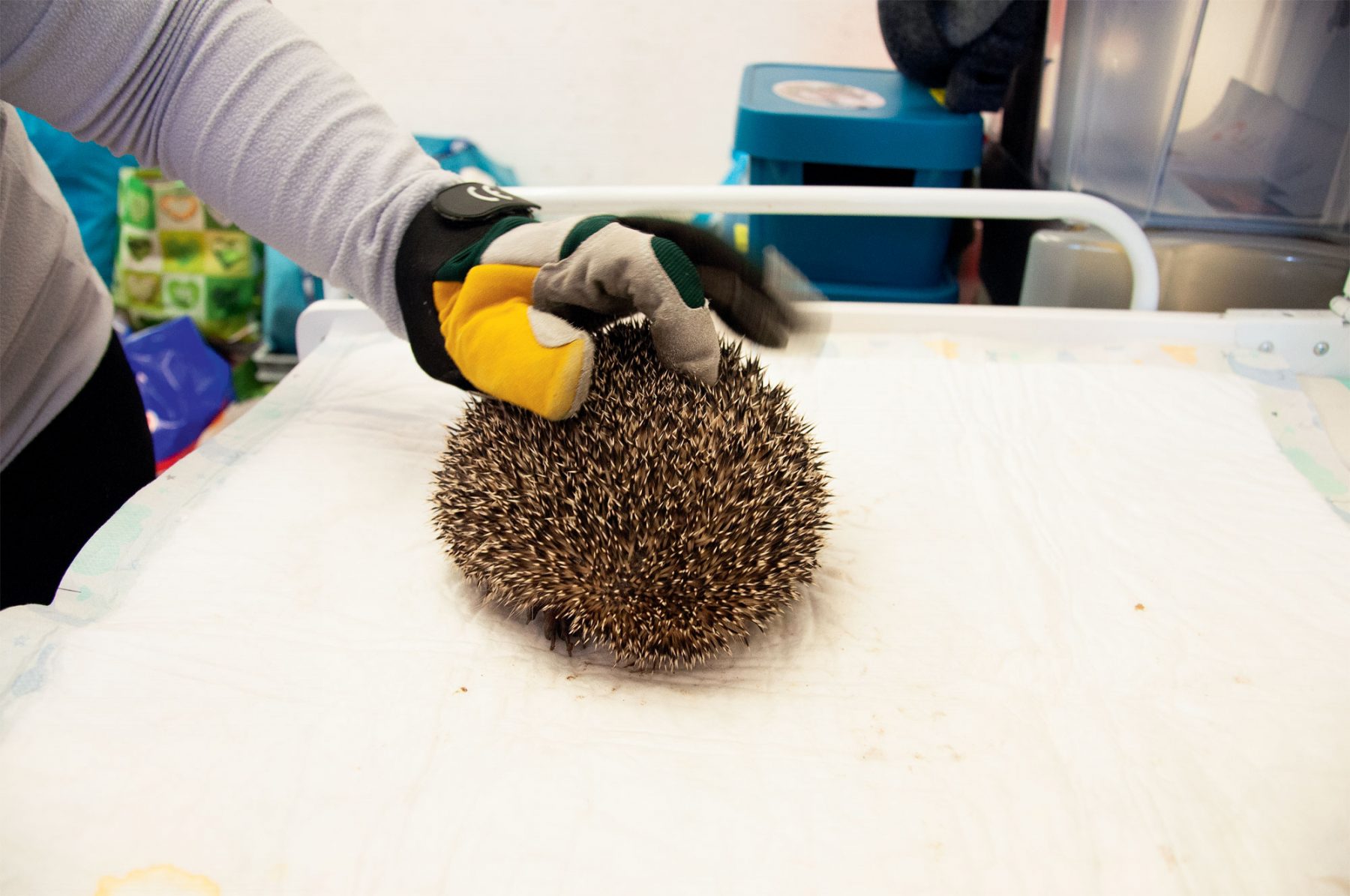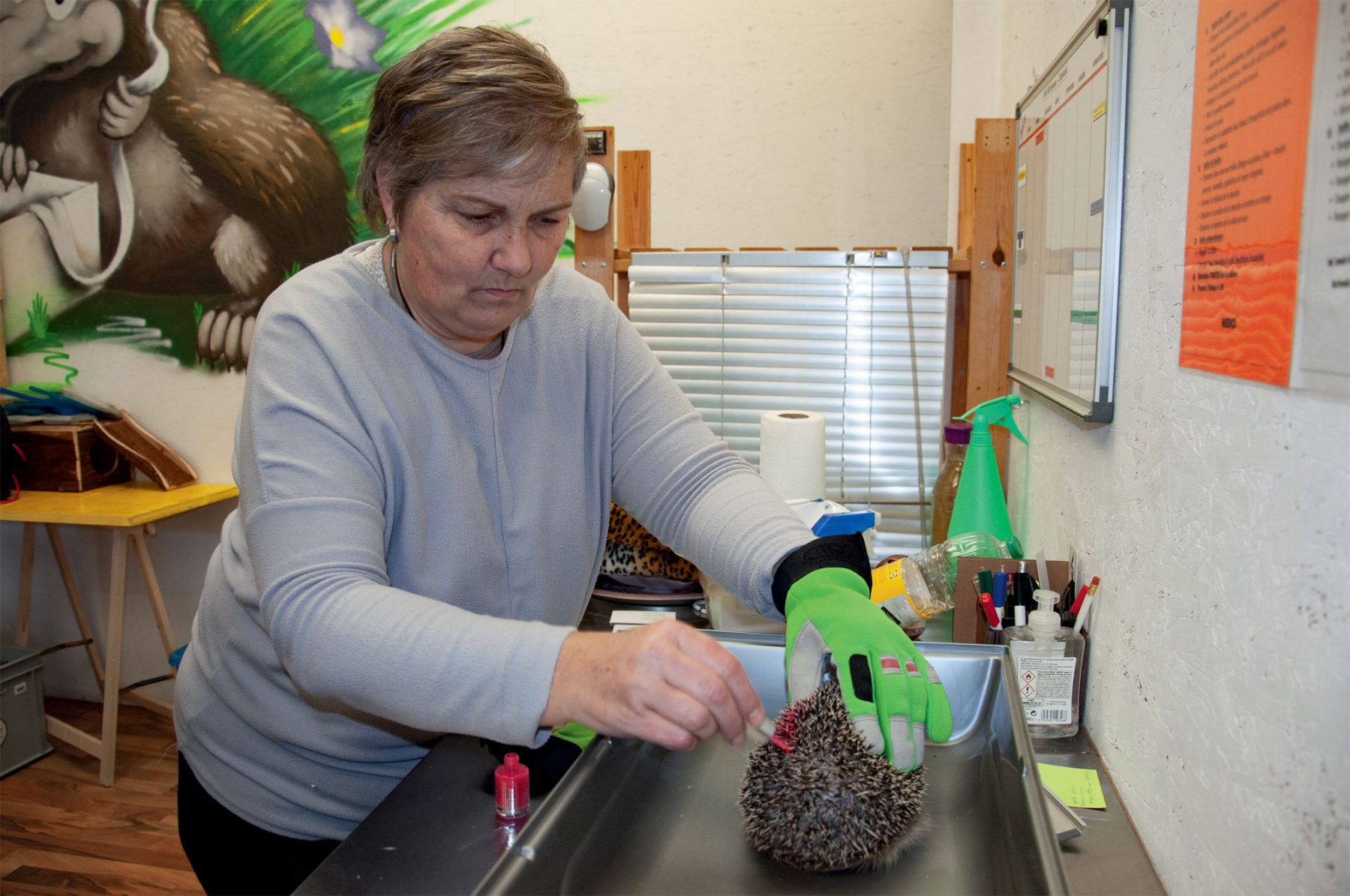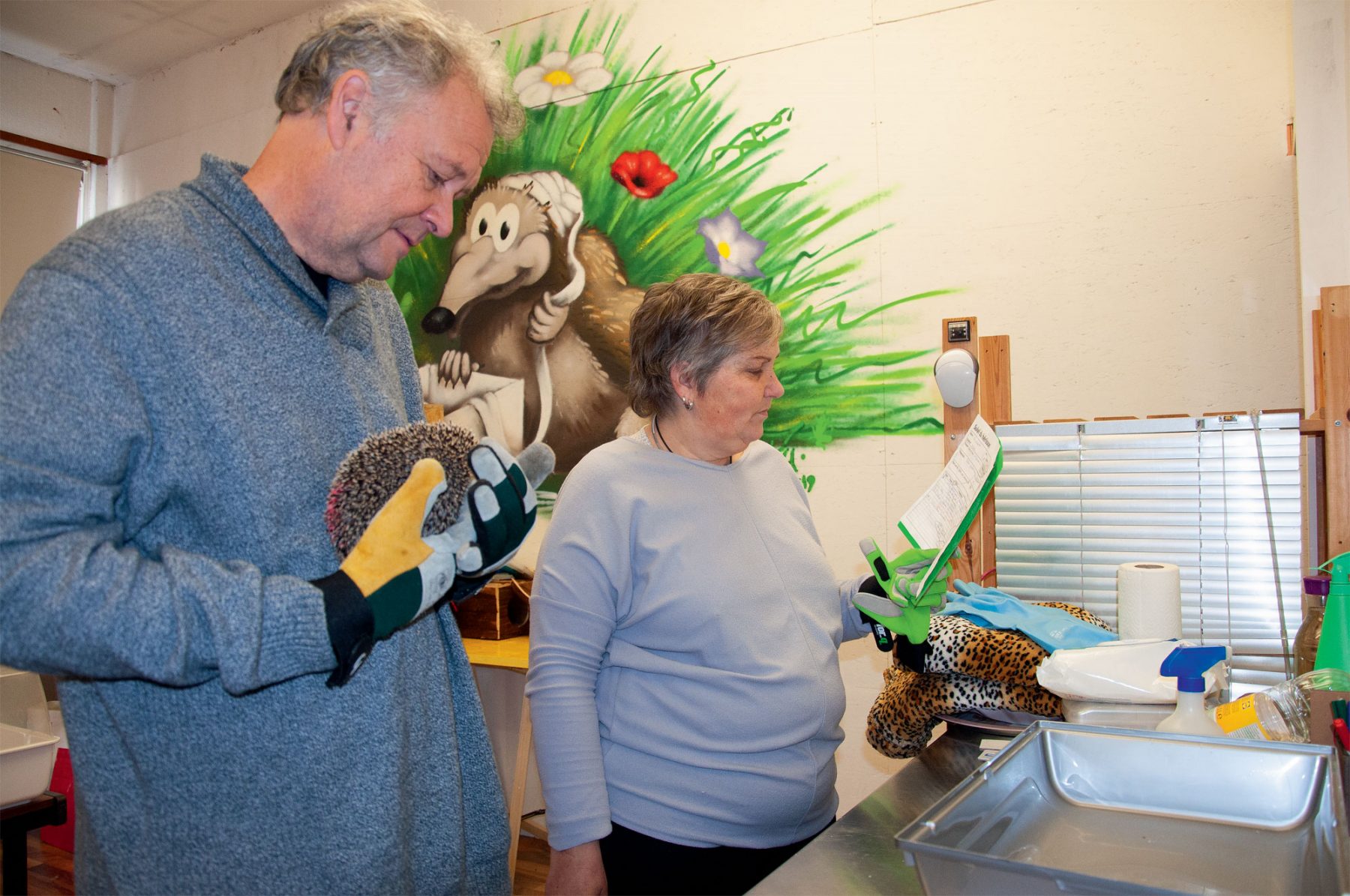 Pendant que le mari procède à la pesée d’Elisabeth, une hérissonne qui retrouvera bientôt la liberté, son épouse observe Véronique Schorro désinfecter la plaie de Virya, dont la mâchoire et le flanc droit ont été lacérés par une débroussailleuse. Vu leur aisance, le couple devrait bientôt être autorisé à prendre en charge des hérissons.