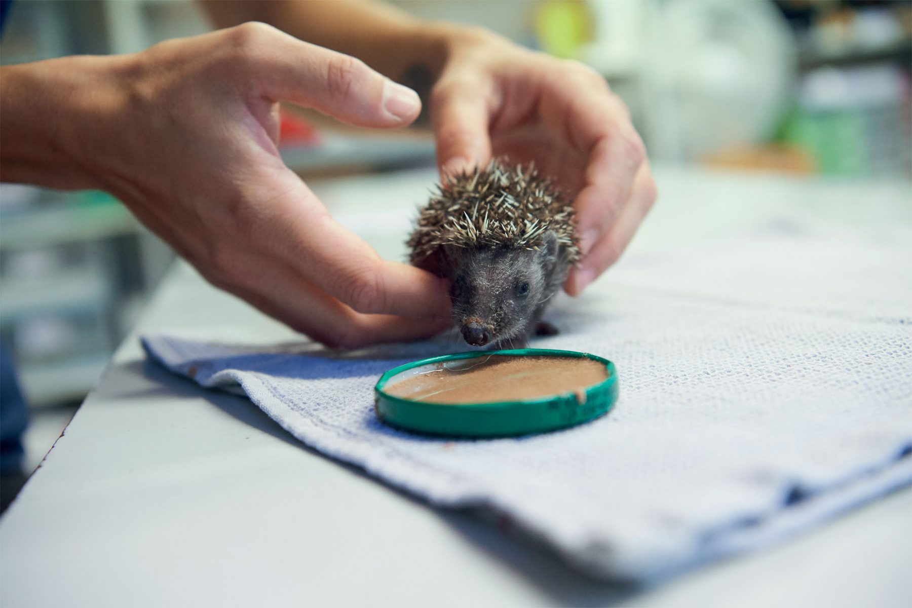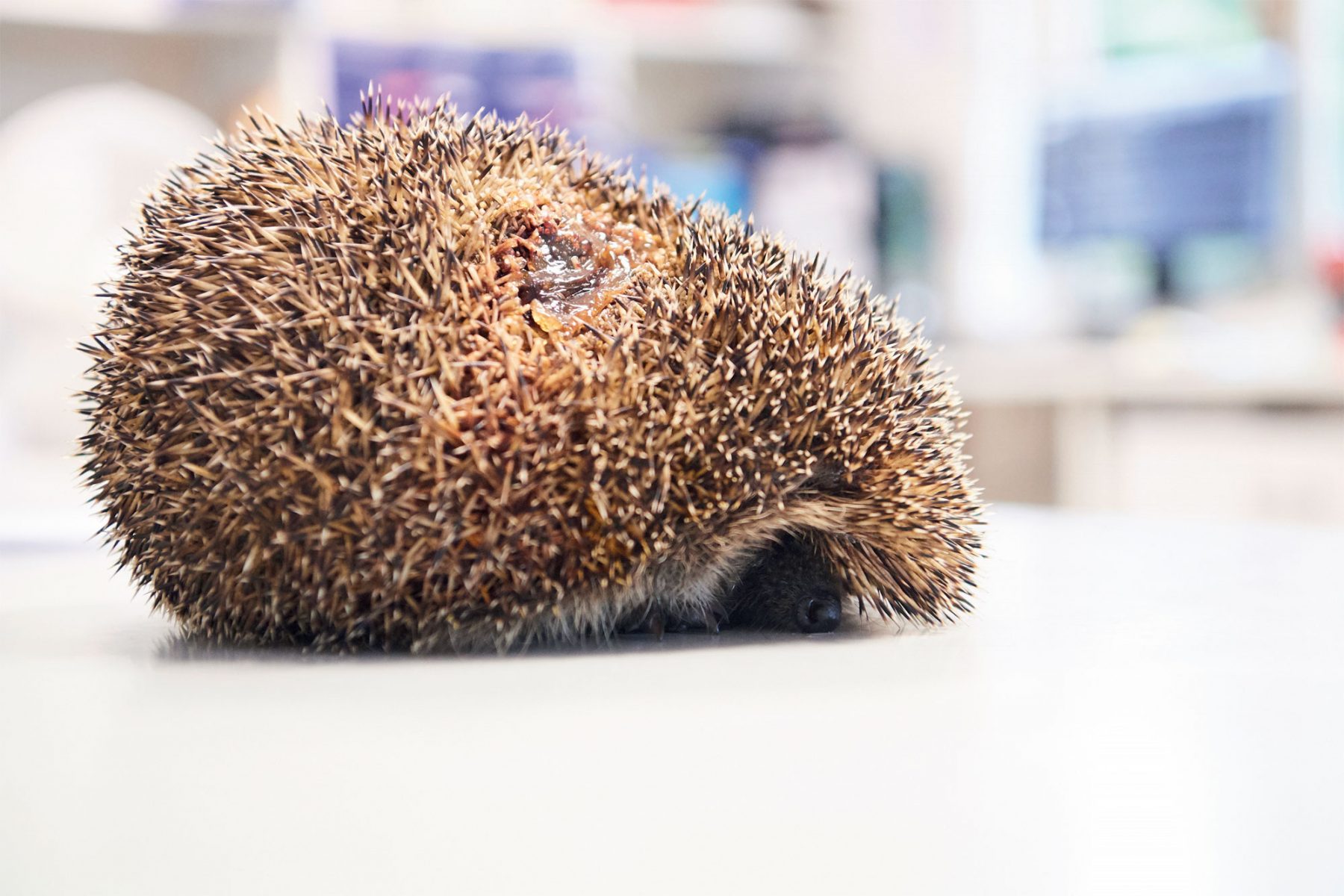 Roulé en boule sur la table d’examen, un hérisson porte les stigmates d’une attaque de chien. Deux orifices rouges, d’autant plus saillants que des piquants ont dû être rasés pour les soins. « Heureusement nous avons pu le traiter avant que la plaie ne s’infecte. Dès qu’il aura cicatrisé et que ses piquants auront repoussé, nous le relâcherons », se réjouit Gilles Moyne, directeur du Centre Athénas.