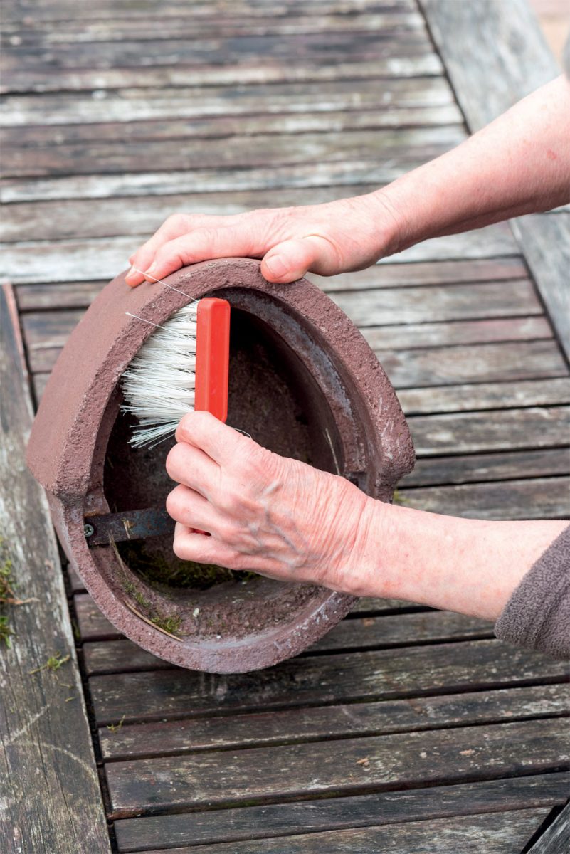 Sortez le nid et les matériaux accumulés avec des gants. Nettoyez l’intérieur du nichoir avec une brosse métallique et grattez les parois avec une spatule. Si des dépôts persistent, versez de l’eau bouillante pour les détacher. Dans ce cas, laissez ensuite le nichoir ouvert pendant une journée pour qu’il sèche.