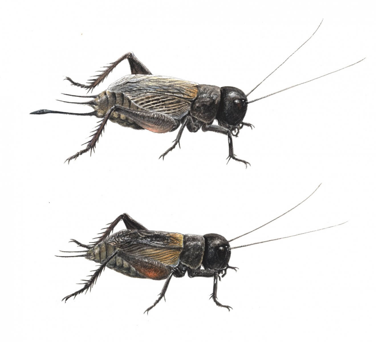 La femelle du grillon (en haut) se reconnaît très facilement au long sabre qui prolonge son corps vers l'arrière. Cet oviscapte sert à enfouir les œufs dans la terre. Dépourvu de cet organe spectaculaire, le mâle n'a que deux fins appendices sensoriels à l'arrière du corps: les cerques, également visibles chez la femelle. Un peu plus petit, il a les élytres bardés d'épaisses nervures qui participent à la production du chant.