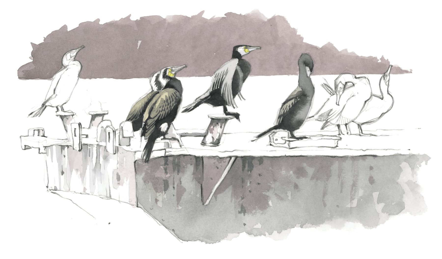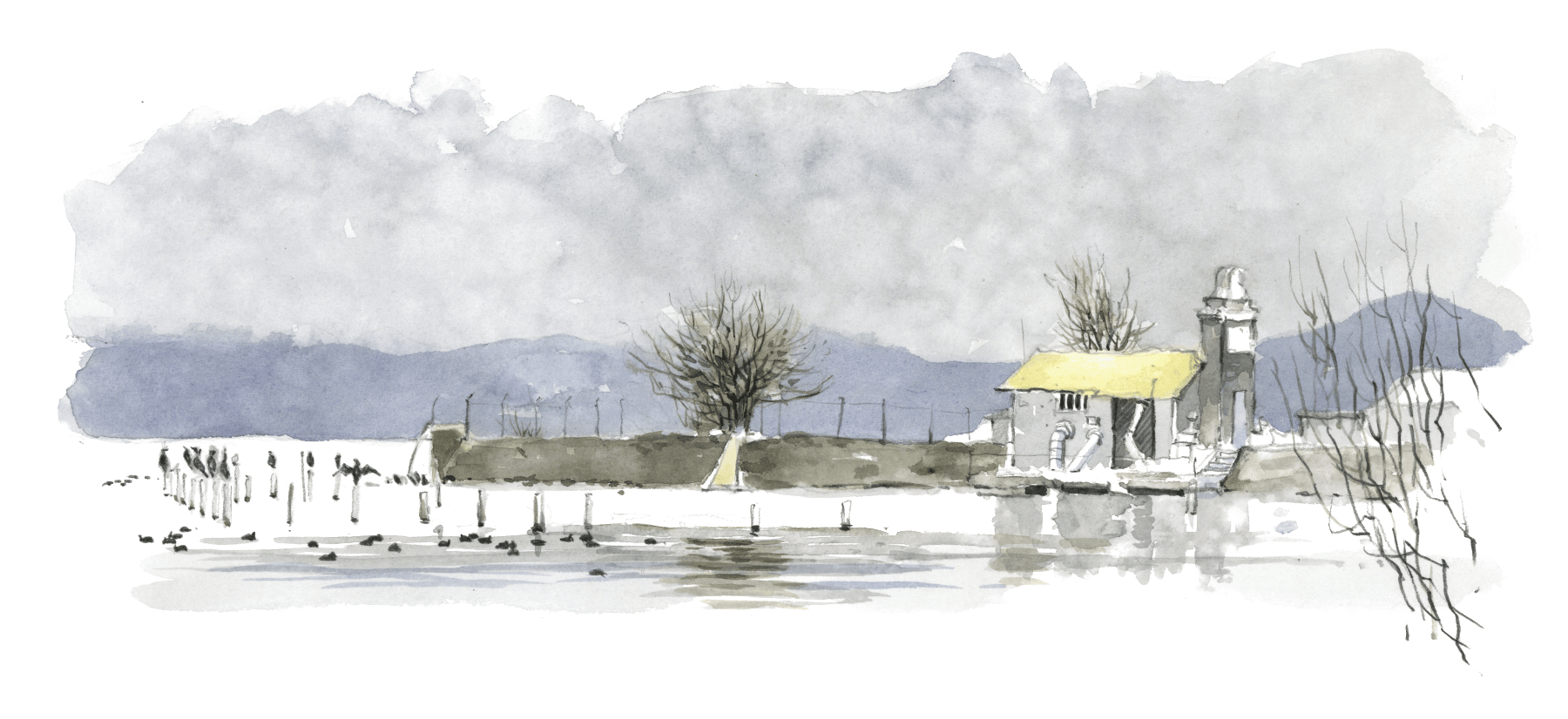 Le lendemain de bonne heure, retour au bord de l’eau : -5 °C, froid de canard. Le dortoir des cormorans se réveille et se vide au compte-gouttes. Au milieu du lac, le petit-déjeuner est servi. Les oiseaux atterrissent en glissade sur l’eau et se mettent à nager en plongeant régulièrement la tête.