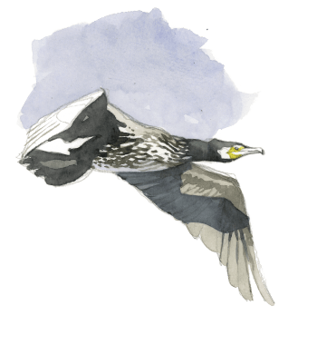 Les oiseaux sombres descendent maintenant vers la surface de l’eau. Leur long cou tendu donne l’impression que les ailes sont trop en arrière. Toujours pas reconnus ? Ce sont des grands cormorans ! Le soir venu, ils se rassemblent pour passer la nuit sur des vieux saules au milieu de la roselière. Les enrochements au large du port ou des radeaux font également office de dortoir, surtout à cette saison où une partie des populations nordiques vient hiverner en France et en Suisse.