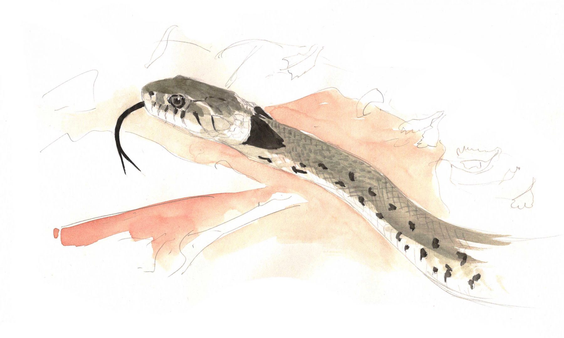 Milieu de matinée, mi-ombre, mi-lumière, j'avance doucement en fauchant un sentier dans l'herbe luxuriante du jardin. C'est la première fois de l'année que je sors la lame, il faut être très prudent car la petite faune apprécie le refuge dense et frais de la prairie. En arrivant près de la mare, j'aperçois une couleuvre lovée sur une vieille tuile posée exprès pour elle. Elle prend le soleil. Je suis désolé de la déranger mais le mal est fait, elle étend son long corps et file à couvert plutôt lentement. Une trace humide sur la tuile et un renflement au niveau de l'estomac me font supposer que le serpent vient de capturer une proie dans le petit point d'eau et qu'il s'apprêtait à la digérer au chaud.