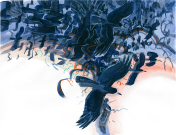 L’image se précise, des milliers de corbeaux emplissent le ciel. Une partie d’entre eux déboule en rase-mottes au-dessus des toits. D’autres arrivent de plus haut et certains tombent littéralement des nuages pour dégringoler sur la ville. Leur destination ne fait aucun doute : les volatiles s’abattent sur la canopée du vaste parc. Dois-je craindre ces spectres qui commencent à se rassembler au-dessus de ma tête en lançant des cris d’orfraie ?